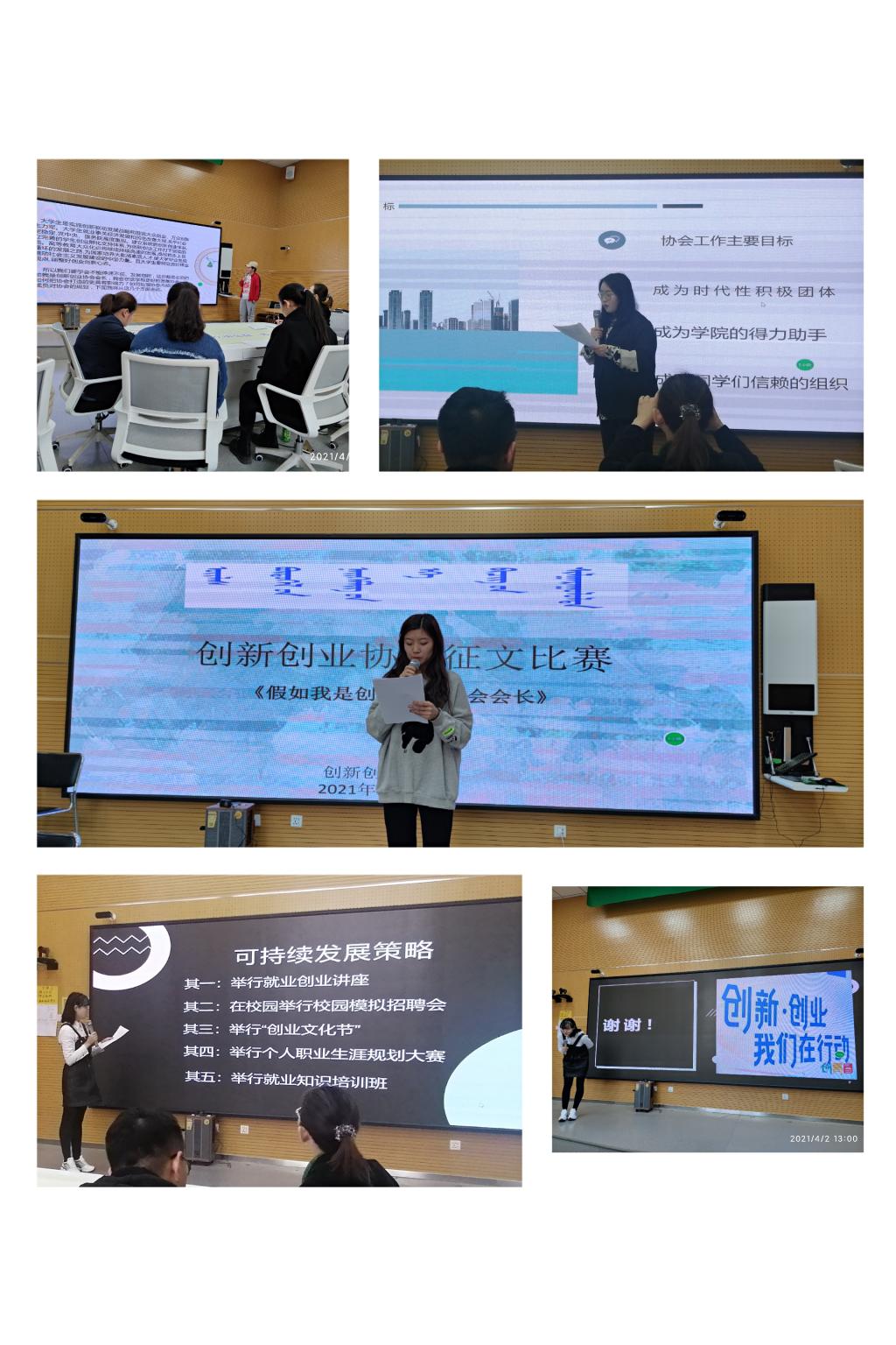 為充分鍛煉創(chuàng)新創(chuàng)業(yè)協(xié)會(huì)同學(xué)們的創(chuàng)新能力與創(chuàng)新思維,發(fā)揮同學(xué)們的主觀能動(dòng)性,推動(dòng)創(chuàng)新創(chuàng)業(yè)協(xié)會(huì)工作,由創(chuàng)新創(chuàng)業(yè)學(xué)院策劃、布置了以《假如我是創(chuàng)新創(chuàng)業(yè)協(xié)會(huì)會(huì)長(zhǎng)》為題的征文比賽,于2021年3月29日中午和4月2日中午分兩場(chǎng)在體育館五樓正式舉行。3月29日首場(chǎng)征文比賽上創(chuàng)新創(chuàng)業(yè)學(xué)院院長(zhǎng)哈斯同力嘎做了開場(chǎng)講話,為同學(xué)們鼓氣加油并提出些許殷切期望。兩場(chǎng)比賽分別邀請(qǐng)了各5名創(chuàng)新創(chuàng)業(yè)骨干教師當(dāng)評(píng)委,有心物教育專任創(chuàng)新創(chuàng)業(yè)課程講師王新域、巴雅爾,創(chuàng)新創(chuàng)業(yè)骨干教師陳玉珍、敖日罕、張璟華、白寶華、珠麗等諸位教師,為參賽者進(jìn)行現(xiàn)場(chǎng)評(píng)比打分。經(jīng)過兩場(chǎng)激烈角逐,征文比賽落下帷幕。4月22日,在體育館五樓舉行征文比賽頒獎(jiǎng)儀式,評(píng)決出一等獎(jiǎng)一名、二等獎(jiǎng)三名、三等獎(jiǎng)五名,并對(duì)對(duì)獲獎(jiǎng)學(xué)生頒發(fā)獎(jiǎng)狀,以資鼓勵(lì)。在各位老師與協(xié)會(huì)成員的共同努力下,此次征文比賽圓滿完成。