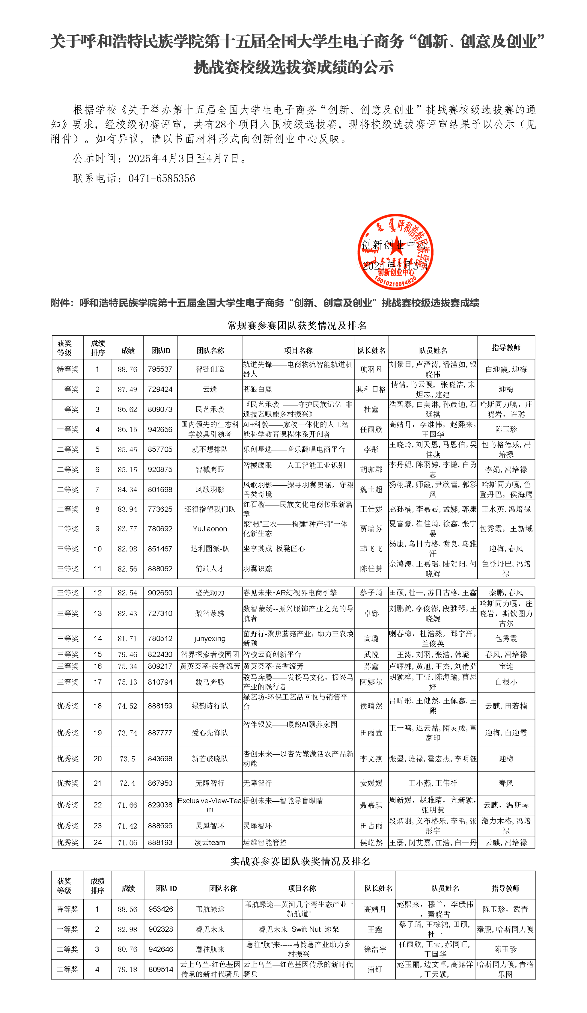 關(guān)于呼和浩特民族學(xué)院第十五屆全國(guó)大學(xué)生電子商務(wù)“創(chuàng)新、創(chuàng)意及創(chuàng)業(yè)”挑戰(zhàn)賽校級(jí)選拔賽成績(jī)的公示