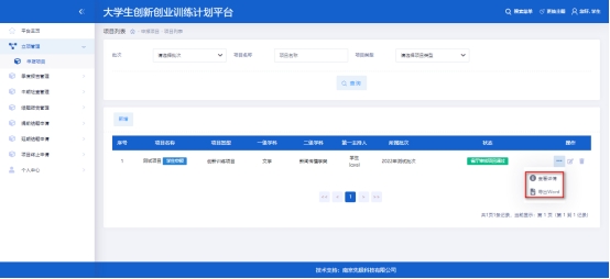 項目提交后,點擊“查看詳情”按鈕,可以看到本項目填寫的詳細內容以及項目現在狀態,點擊“導出Word”按鈕,可以將申報書導出。