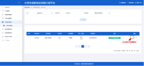 項目所有季度報告和中期檢查審核通過后,學生登錄系統點擊“結題管理”下的“填寫結題報告”菜單,點擊“+”按鈕,填寫結題報告。填寫結題報告后,可以先“暫存”,暫存時可以修改或刪除,提交后,則不能修改。