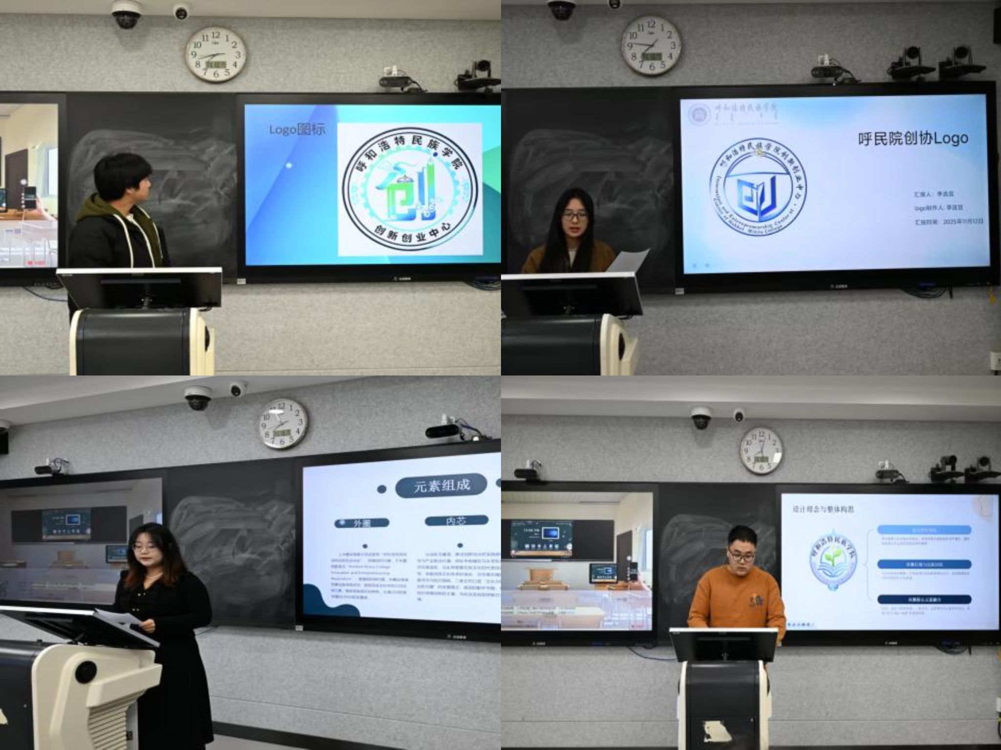 現(xiàn)場(chǎng)賽氣氛熱烈,采取ppt演講的方式來(lái)展示設(shè)計(jì)作品,詳細(xì)描述圖標(biāo)的設(shè)計(jì)原理、設(shè)計(jì)意義及未來(lái)展望。每個(gè)作品的設(shè)計(jì),同學(xué)們都充分發(fā)揮想象力和動(dòng)手能力,選擇手繪或軟件繪制方式,融入北疆文化元素,體現(xiàn)地域特色與雙創(chuàng)精神的結(jié)合,紛紛設(shè)計(jì)出大方美觀、富有特色的圖標(biāo),充分體現(xiàn)了辨識(shí)度與視覺(jué)沖擊力。有的作品巧妙地將蒙古盤腸紋、云紋等傳統(tǒng)圖案結(jié)構(gòu),與現(xiàn)代科技線條交織,寓意在北疆深厚的歷史文脈中,創(chuàng)新力量綿延不絕、生生不息;有的則以白馬精神為靈感,勾勒出奮發(fā)向上的創(chuàng)業(yè)圖騰,象征創(chuàng)業(yè)者們?nèi)绫苯`般堅(jiān)韌、智慧與勇敢;更有作品將“創(chuàng)”字藝術(shù)化,變形為互聯(lián)互通的數(shù)據(jù)節(jié)點(diǎn),或把蒙古包的結(jié)構(gòu)幻化為包容開(kāi)放的創(chuàng)新孵化空間,生動(dòng)詮釋了傳統(tǒng)與現(xiàn)代的完美融合。