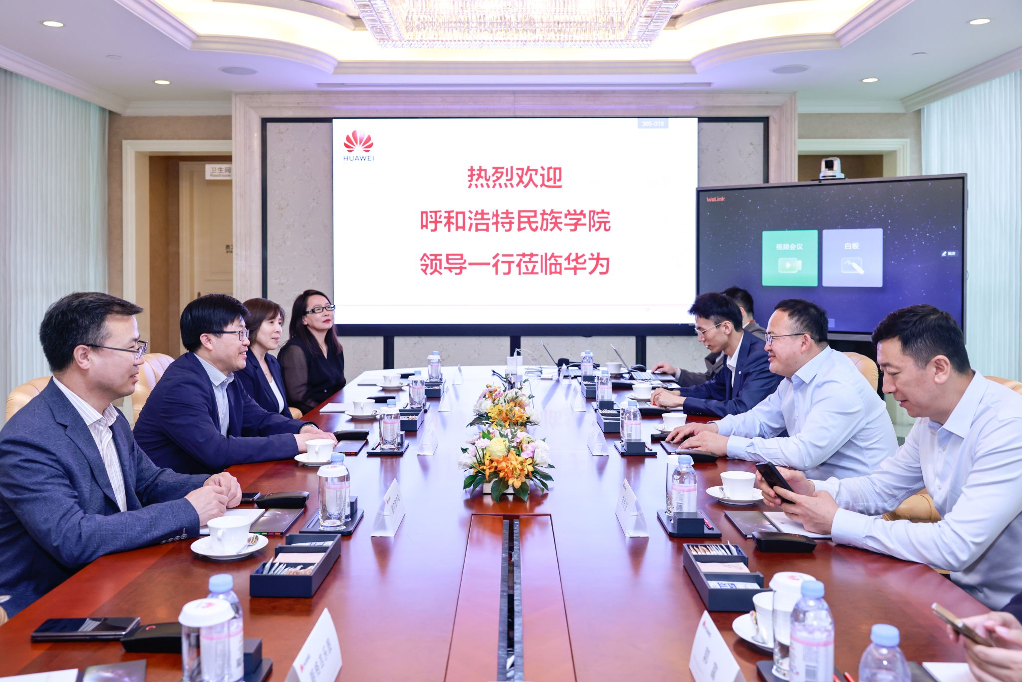 華為內蒙古政企業務總經理張玉德、學校黨委副書記、校長韓偉新出席簽約儀式并致辭,華為內蒙古政企教育行業代表郝鑫宇和我校黨委委員、副校長額爾敦布和代表校企雙方簽署合作協議,華為企業與培訓認證部全球院校業務總監黨張波出席儀式,華為公司相關負責人及學校黨政辦、教務處、計算機科學學院負責人參加簽約儀式。