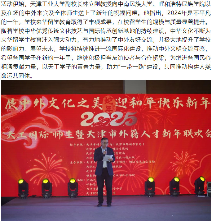 中南民族大學、呼和浩特民族學院、天津市科學技術局(天津市外國專家局)、天津市教育委員會國際交流處、天津市公安局出入境管理局、布基納法索納茲博尼大學孔子學院、中南民族大學、呼和浩特民族學院、天津市南開區五馬路小學、天津歌舞劇院民樂團、天津工業大學中華優秀傳統文化與技藝國際傳承創新基地共建單位非遺大師、天津市外籍人才,與天工國際全體師生齊聚一堂,共賀新年,共同描繪出一幅各國文化交融碰撞、世界青年民心相通的動人畫卷。