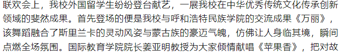 本次活動展示了北疆文化的魅力,是我校推動來華留學生交流工作的一次積極實踐,提升了學校的影響力。在以“文化”為載體,充分發揮以文載道、以文傳聲、以文化人,推動中華文化更好走向世界,講好中國故事,傳播好中國聲音上貢獻了呼民院力量。