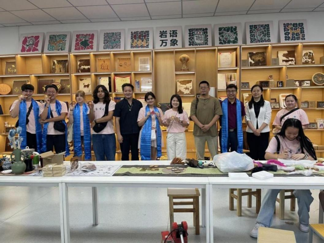 訪問團師生在美術與設計學院參觀了非遺美術作品展,走進自治區級創新工作室“木仁創新工作室”,學習體驗了皮畫、毛氈等非遺美術作品制作,感受到了北疆非遺技藝里的匠心與文化密碼,在創作互動中實現了審美與情感的跨文化共鳴。