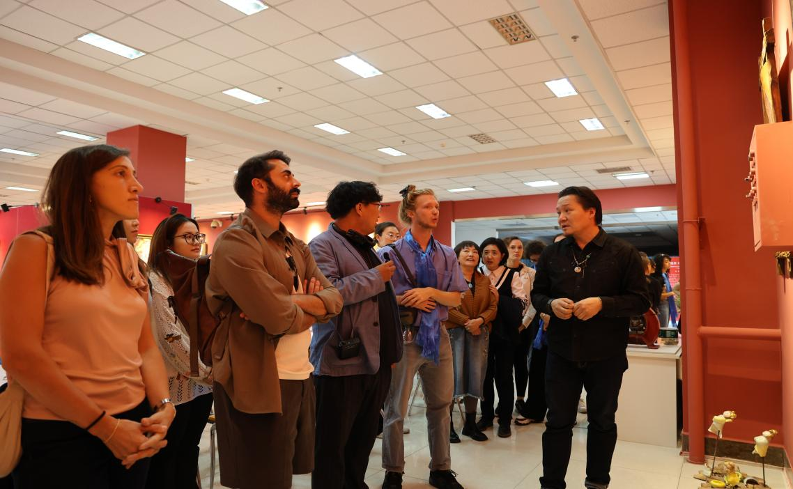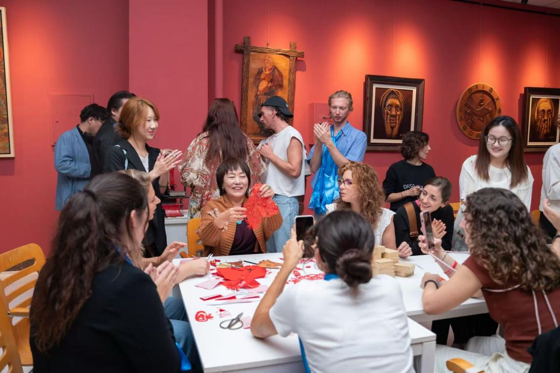 藝術交流之外,非遺文化體驗與武術教學實踐讓交流維度進一步拓展。在美術與設計學院教師木仁的帶領下,訪問團參觀了我校師生非遺美術作品展,并走進自治區級“木仁創新工作室”,沉浸式體驗毛氈、剪紙、皮畫等非遺手工藝品制作。這一過程不僅讓意大利師生感受了中國傳統非遺的藝術風格與匠心精神,更成為我校美術與設計學科依托地域文化特色、開展實踐教學與文化傳播的生動展示。