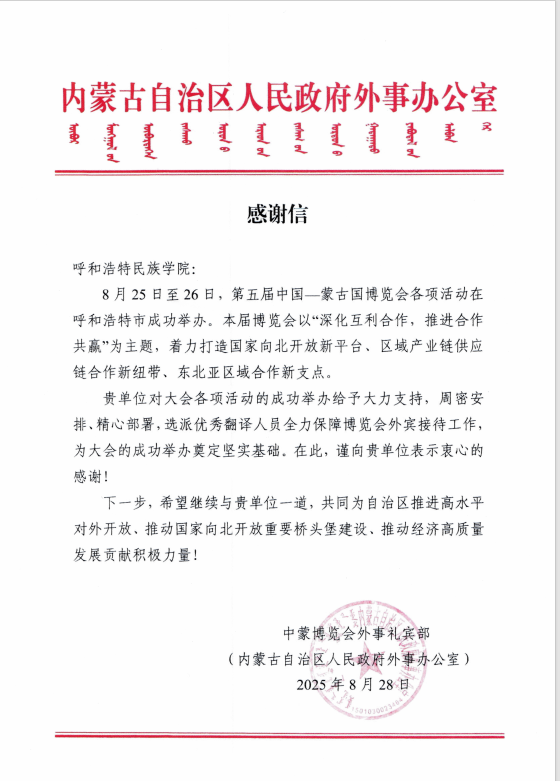 8月25日,第五屆中國—蒙古國博覽會在呼和浩特開幕,我校外國語學院教師包金蘭、商學院教師巴達拉夫在會議期間擔任翻譯,來自多個專業的60余名學生擔任志愿者,他們以扎實的專業能力、飽滿的服務熱情和嚴謹的工作態度,在多項重要活動中承擔志愿服務與會務支持工作,為推動中蒙交流合作貢獻力量。內蒙古自治區人民政府外事辦公室中蒙博覽會外事禮賓部向我校發來感謝信,對我校志愿者在博覽會期間的突出貢獻予以高度認可。