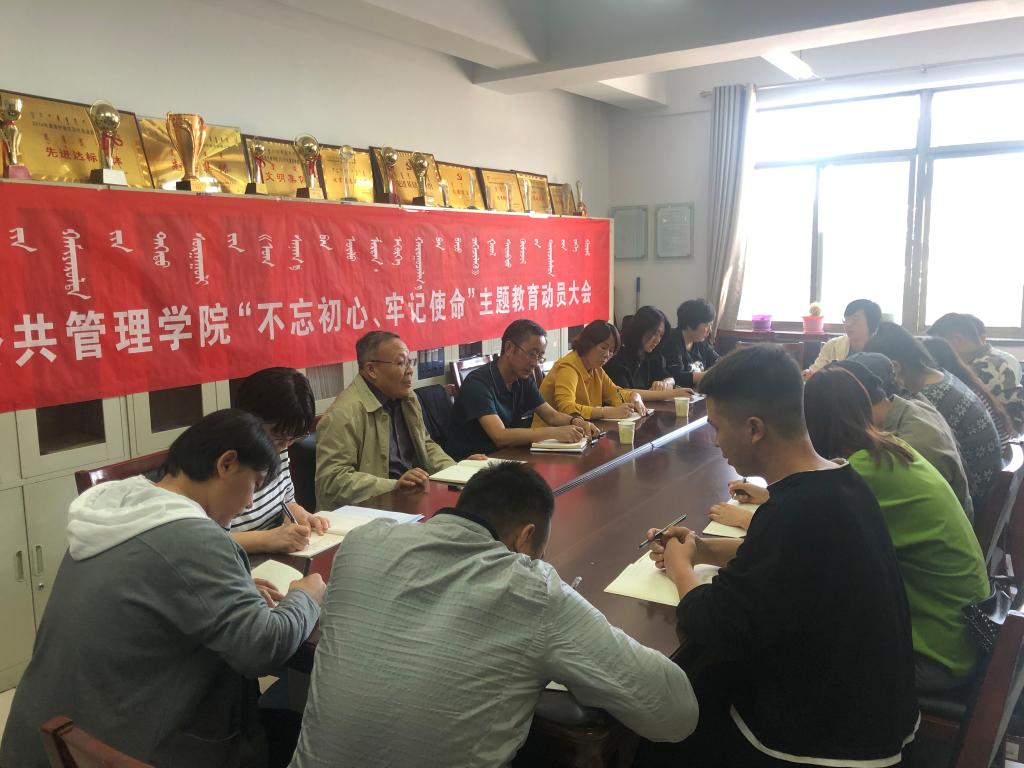 首先由黨總支副書記額爾敦格日樂老師傳達了公共管理學院開展“不忘初心、牢記使命”主題教育活動相關方案,同時對主題教育的開展進行部署動員講話。