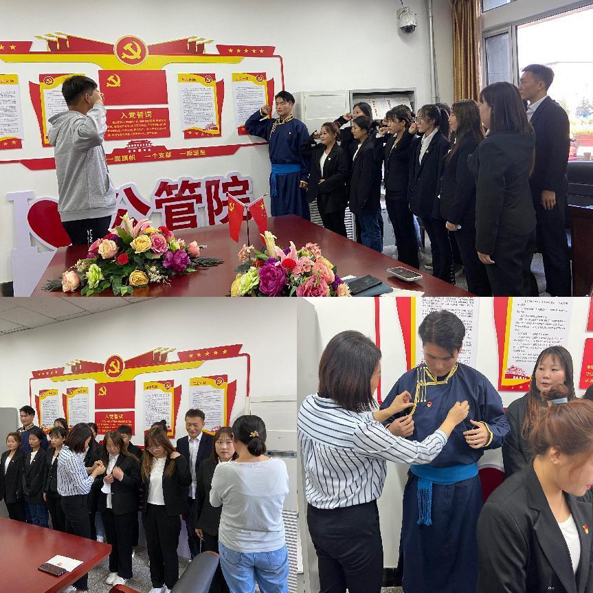 活動中,黨總支書記海霞、黨總支副書記額爾敦格日勒為學生黨員親自發放并佩戴黨徽,向黨支部成員發出“戴黨徽 亮身份、樹形象 做表率”的倡議,要求學生黨員不斷提升服務學生的能力,自覺踐行“四個合格”標準,自覺接受師生監督,用實際行動發揮黨員先鋒模范帶頭作用。