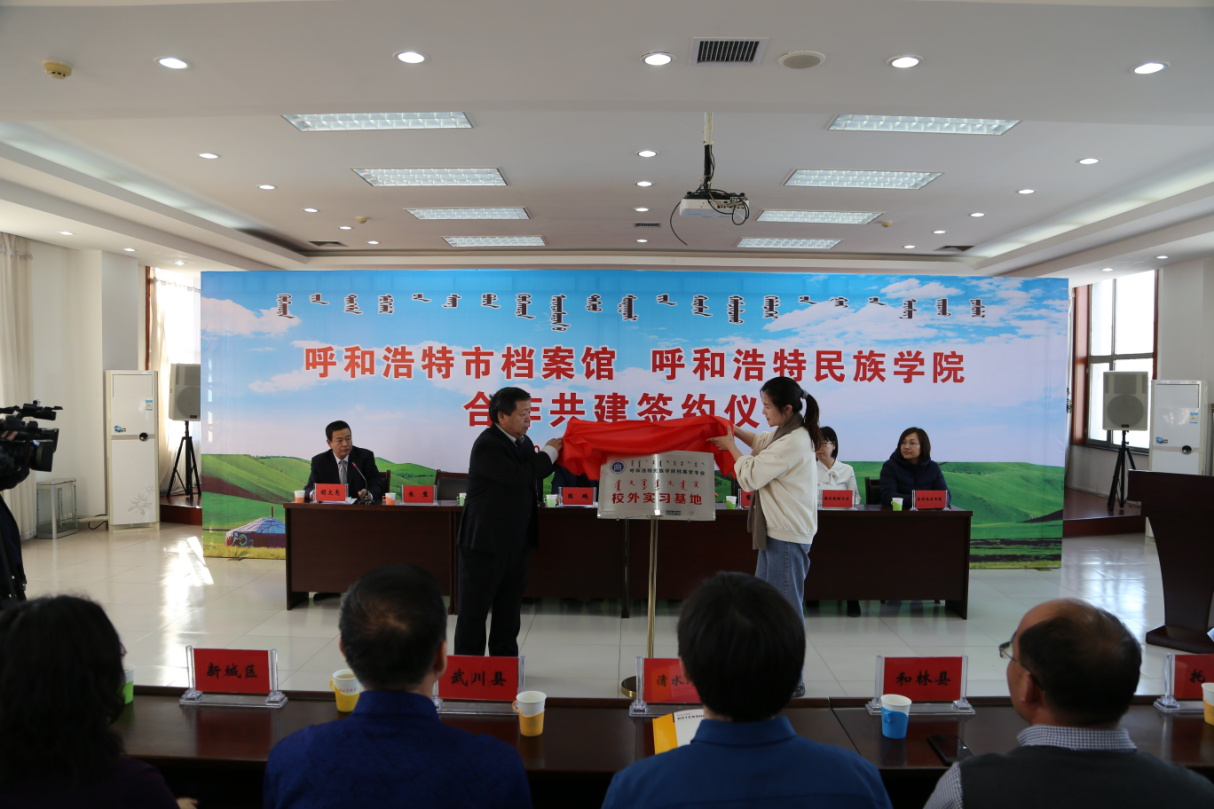 教務處副處長佟繁榮、公共管理學院黨總支副書記額爾頓格日勒、院長吳寶山、副院長敖特根蘇布德,呼和浩特市市委副秘書長、市檔案局局長陳鵬,市委組織部副部長、老干部局局長張利利,公共管理學院檔案學教研室教師和檔案學專業學生代表及市檔案館全體干部職工參加了簽約及揭牌儀式。