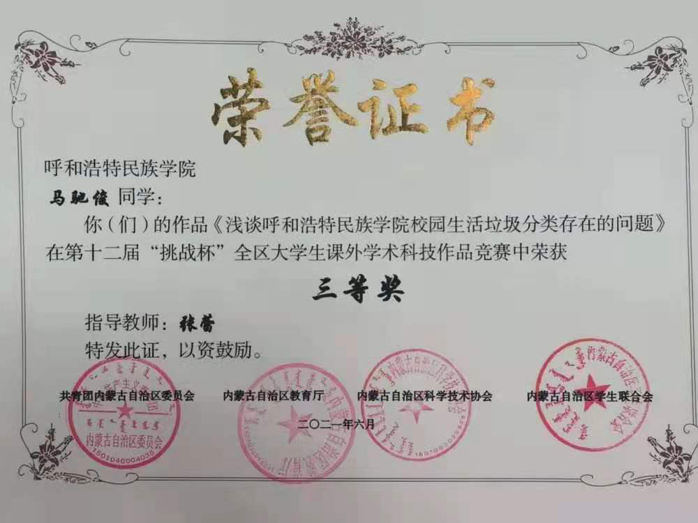 由共青團內蒙古自治區委員會、內蒙古自治區教育廳、內蒙古自治區科學技術協會和內蒙古自治區學生聯合會主辦的第十二屆“挑戰杯”全區大學生課外學術科技作品競賽中我院學生喜獲佳績。學院教工黨支部深入貫徹落實黨史學習教育部署要求,黨員教師亮出身份、履行職責,為學生們提供競賽指導,筑夢成長。在張蕾老師和代陽老師的精心指導下,我院于爽同學的參賽論文《試論網絡輿論對食品安全危機監督的作用》、馬馳俊同學的參賽論文《淺談呼和浩特民族學院學生校園生活垃圾分類存在的問題》和寧喜強同學的參賽論文《校園暴力中的隱性領導者》在本次比賽中分別榮獲“三等獎”。