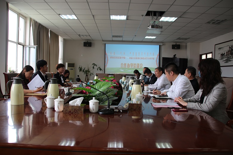 雙方就合作辦學工作召開了座談會,校長格日樂圖同志主持會議,黨委委員、副校長賀希格吉雅及黨政辦公室、教務處、就業指導處、財務處負責同志參加會議。格日樂圖校長、張寶成校長分別介紹了各自學校的發展歷程、學科專業設置、師資隊伍建設、人才培養等情況,雙方就兩校的合作辦學事宜進行了交流,簽署了2020年跨校選拔專升本學生的合作辦學框架協議。格日樂圖校長表示希望兩校開展更廣泛的合作交流,共同為自治區民族教育事業的發展做出自己的貢獻。