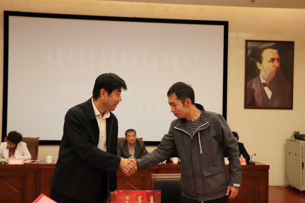 5月26日下午,學校在圖書館一樓報告廳召開2020年全面從嚴治黨暨落實“六項責任制”工作會議。學校黨政領導、黨委委員、紀委委員、全校副處以上干部、各黨總支紀檢委員,黨支部書記代表參加會議。會議由校黨委副書記、校長格日樂圖主持。
