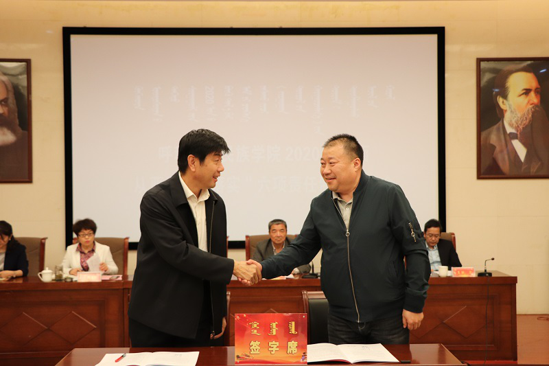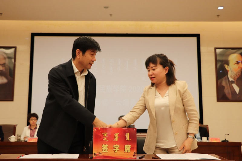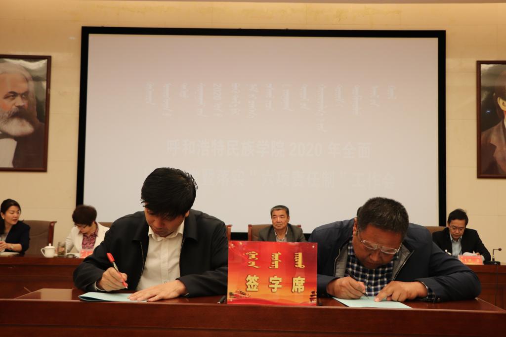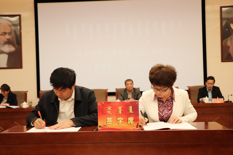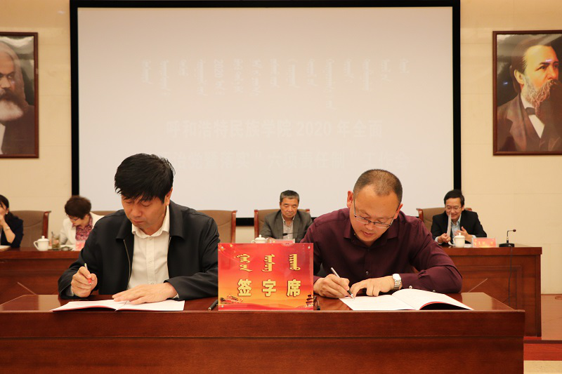 會上,孫國權書記代表學校黨委與校領導班子簽訂“一崗雙責”責任書,與各單位簽訂基層黨建、黨風廉政、意識形態、綜合治理、保密工作、宗教工作責任書,格日樂圖校長代表學校行政與各單位簽訂消防安全責任書。