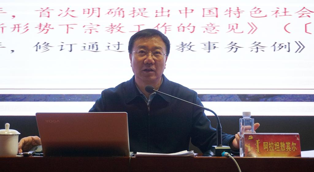 自治區統戰部副部長、宗教局局長阿拉坦敖其爾作報告