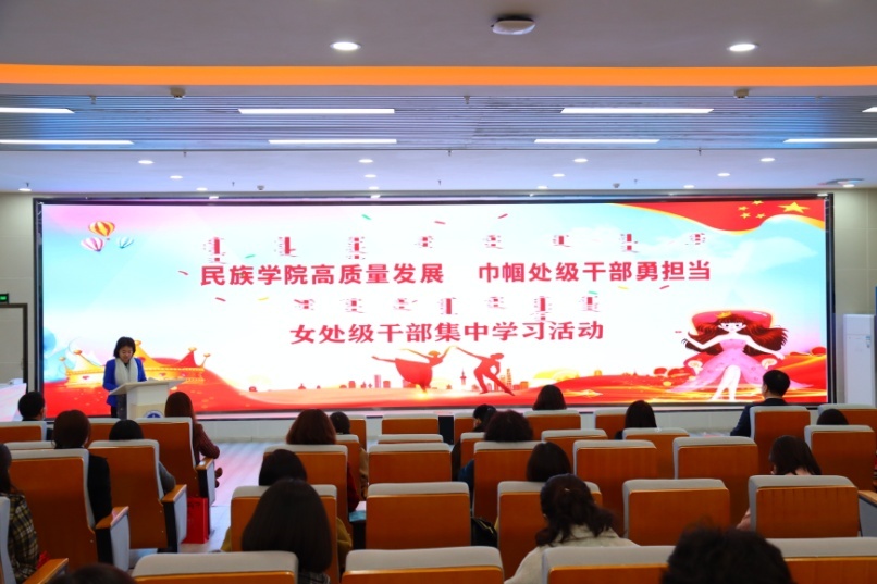 3月8日,為慶祝第111個“三八”國際勞動婦女節(jié),激發(fā)全校女教職員工愛崗敬業(yè)、建功新時代的豪情,展現(xiàn)女教職員工昂揚向上、健康文明的良好精神風貌,以更加飽滿的工作熱情創(chuàng)造新業(yè)績、展現(xiàn)新作為,我校黨委組織部、工會、馬克思主義學院聯(lián)合舉辦“民族學院高質(zhì)量發(fā)展,巾幗處級干部勇?lián)敗薄幖壐刹考袑W習活動。校黨委副書記胡春梅,副校長納麗娜,黨委委員、宣傳部部長王玉玲,黨委委員、組織部部長吳阿古拉,工會主席邢文岐以及全校女處級干部等50余人參加活動。