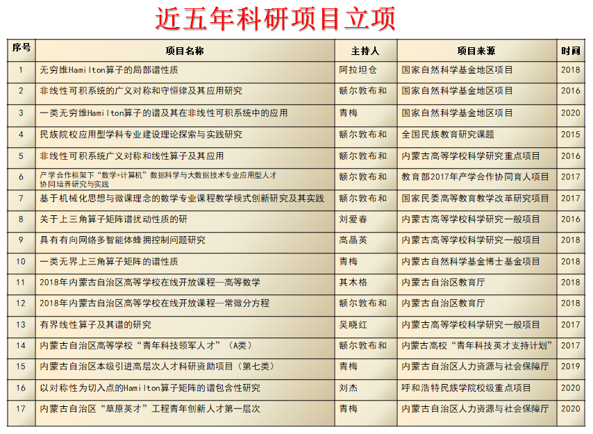 研精殫思,碩果累累。近五年,該專業團隊成員先后獲批國家自然科學基金項目3項、全國民族教育研究課題1項、教育部協同育人項目1項、自治區人才項目2項、自治區自然科學基金項目2項和其它省部級教學科研項目20多項;在《中國科學》《數學學報》《journal of mathematical analysis and applications》等國內外刊物上發表學術論文70多篇,其中SCI收錄30多篇;出版教材和專著5部;邀請中國科學院張恭慶院士等國內外專家學者40余人次,組織參加各類教學科研會議50余人次,承辦第八屆非線性數學物理國際會議暨全國第十五屆可積系統學術研討會(2019年)等會議。2019年,數學學科獲批為國家民委重點學科。
