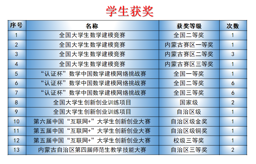 天道酬勤,一樹百獲。近幾年,該專業師生先后獲得全國高校數學微課程教學設計競賽全國一、二等獎;全國大學生數學建模競賽二等獎等50多項省部級各類獎項;現有自治區高等學校在線開放課程2門(2018年)和精品在線開放課程(金課)1門(2021年);建設自治區高等學校實驗教學示范中心(2017年)1個和教育部民族教育發展中心重點研究基地(2015年)1個,掛靠學校成立內蒙古高等教育學會數學教育分會(2016年);先后20多名學生考取太原理工大學、陜西師范大學、內蒙古大學等高校碩士研究生,其中3人分別直推為武漢科技大學和內蒙古大學的博士研究生。特別是,2018年實現學校高等教育自治區級教學成果一等獎零的突破。
