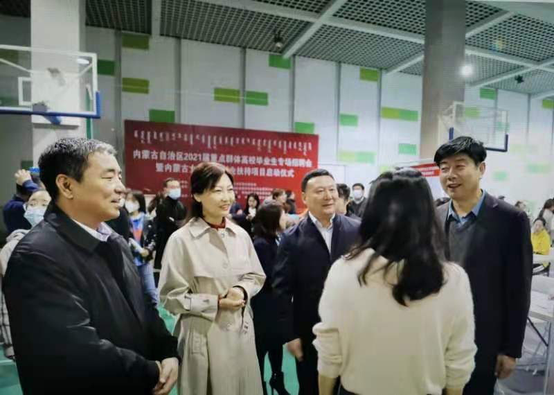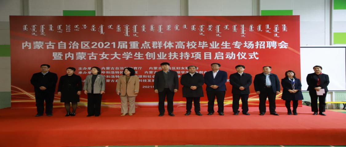 為深入貫徹落實黨中央、國務院及自治區(qū)政府“穩(wěn)就業(yè)”“保就業(yè)”決策部署,積極推進落實高校畢業(yè)生建檔立卡及幫扶對象等重點群體盡早就業(yè),4月15日上午,由內(nèi)蒙古自治區(qū)教育廳、內(nèi)蒙古自治區(qū)婦女聯(lián)合會主辦,呼和浩特民族學院、內(nèi)蒙古自治區(qū)高校學生就業(yè)創(chuàng)業(yè)服務中心、呼和浩特市人力資源和社會保障局、呼和浩特市婦女聯(lián)合會承辦,內(nèi)蒙古啟銘鑫人才科技發(fā)展有限公司、內(nèi)蒙古自治區(qū)女企業(yè)家協(xié)會協(xié)辦的“內(nèi)蒙古自治區(qū)2021屆重點群體高校畢業(yè)生專場招聘會暨內(nèi)蒙古女大學生就業(yè)創(chuàng)業(yè)扶持項目啟動儀式”在我校成功舉行。自治區(qū)婦聯(lián)副主席仲玉霞、自治區(qū)高校學生就業(yè)創(chuàng)業(yè)服務中心主任王俊威、自治區(qū)婦聯(lián)婦女發(fā)展聯(lián)絡部長馮紅、自治區(qū)女企業(yè)家協(xié)會副會長何靜、呼和浩特市人力資源和社會保障局副局長蘭軍,呼和浩特市人才服務中心主任邢滿紅,呼和浩特市婦聯(lián)黨組成員、副主席李淑軍,呼和浩特市新城區(qū)婦聯(lián)主席吳紅霞和我校黨委書記孫國權,黨委副書記、校長格日樂圖,學校黨委委員、副校長韓偉新出席了招聘會啟動儀式。校各部門負責人、二級學院班子成員和輔導員、畢業(yè)班主任,2021屆畢業(yè)生及兄弟院校就業(yè)同仁近1700人參加了本次招聘會。會議由副校長納麗娜主持。