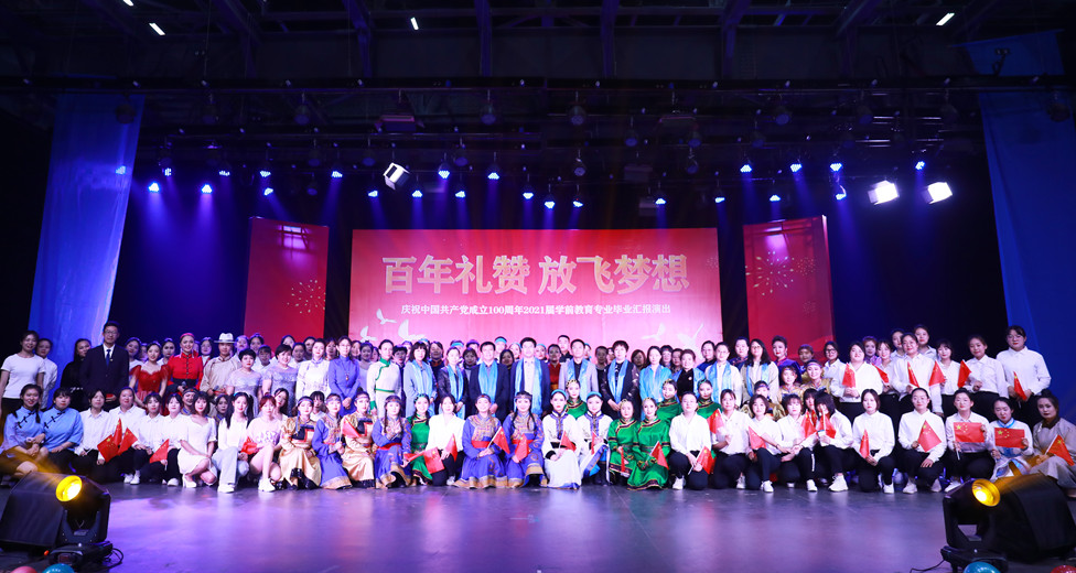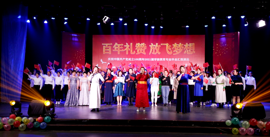 為慶祝中國(guó)共產(chǎn)黨成立100周年,學(xué)前教育學(xué)院于5月27日晚在學(xué)校演播廳舉辦“百年禮贊 放飛夢(mèng)想”2021屆畢業(yè)生匯報(bào)晚會(huì)。學(xué)校韓偉新副校長(zhǎng)、高喜天副校長(zhǎng)、部分部門(mén)負(fù)責(zé)人、呼和浩特市蒙古族幼兒園(南園)園長(zhǎng)烏日勒格、新城區(qū)第一幼兒園園長(zhǎng)計(jì)爽、新城區(qū)第二幼兒園園長(zhǎng)王煜彤、吾樂(lè)貴育兒園園長(zhǎng)烏尼爾其其格、呼和浩特市政府機(jī)關(guān)幼兒園教研組組長(zhǎng)王曉琴、新城區(qū)第十五幼兒園副園長(zhǎng)呼日雅拉圖及部分幼兒園骨干教師代表、學(xué)前教育學(xué)院歷屆優(yōu)秀畢業(yè)生代表出席晚會(huì),學(xué)前教育學(xué)院全體教師、學(xué)生代表觀看晚會(huì)。此次匯演中,學(xué)前教育學(xué)院的學(xué)子充分展現(xiàn)專(zhuān)業(yè)素養(yǎng),匯報(bào)了專(zhuān)業(yè)學(xué)習(xí)成果,并對(duì)學(xué)校和老師的培養(yǎng)表達(dá)了深深的感謝。