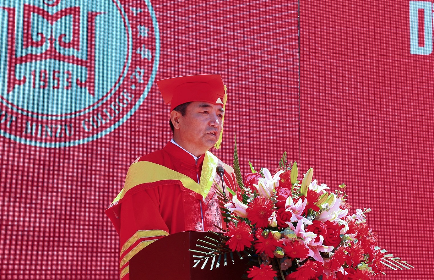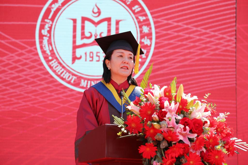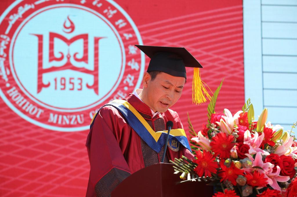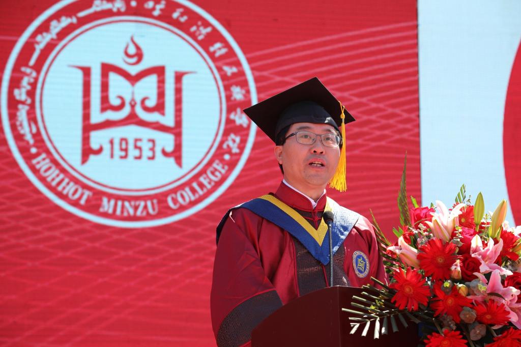 黨委副書記、校長、校學位評定委員會主任格日樂圖致辭。他代表全體師生員工向圓滿完成學業的各位同學表示熱烈的祝賀,向悉心指導的老師們,辛勤勞動的教職員工和望子成龍的家長們表示崇高的敬意和衷心的感謝。他簡要回顧了2021屆畢業生在校期間取得的成績,師生共同推動學校高質量發展的成果。格日樂圖校長給予畢業生五點囑托,一要堅定信念,不忘初心,逐夢前行;二要心懷家國,敢于擔當,將“小我”融入“大我”,成就“民院人”的社會美譽;三要不負韶華,砥礪奮斗。在奮勇搏擊中放飛青春夢想,在砥礪前行中激揚青春力量;四要腳踏實地,勇毅篤行。勤而有恒,事無不成;五要心存善良,學會感恩。感恩學校的栽培、恩師的教誨、父母的養育、同窗的陪伴,感恩偉大的祖國,感恩偉大的黨。講話最后,格日樂圖校長祝愿所有畢業生,都能夠堅定信念、胸懷祖國、腳踏實地、擔當作為,勇立新時代潮頭,開啟人生新篇章!