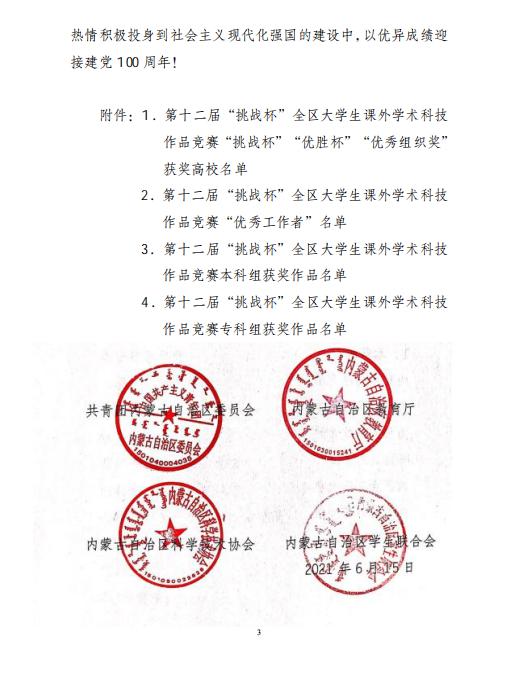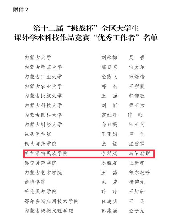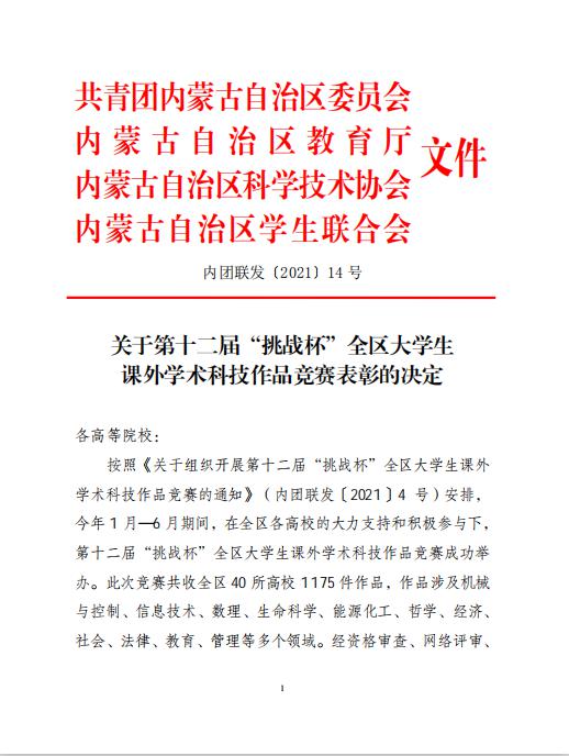 近日,共青團內蒙古自治區委員會、內蒙古自治區教育廳、內蒙古自治區科學技術協會和內蒙古自治區學生聯合會發布《關于第十二屆“挑戰杯”全區大學生課外學術科技作品競賽表彰的決定》。我校在本次競賽中榮獲“優秀組織獎”,李延茂、烏依勒斯被評為“優秀工作者”,參賽學生作品榮獲多個獎項。