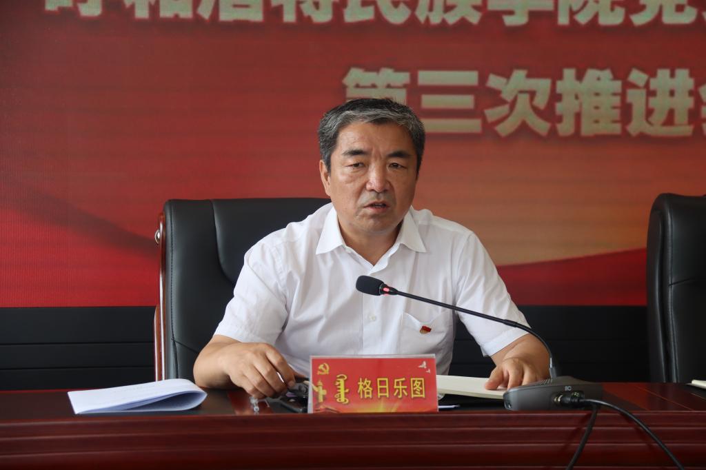 格校長首先傳達了6月21日召開的自治區黨史學習教育調度會上白玉剛部長講話精神。他指出,此次推進會是學校黨委認真貫徹落實自治區召開的全區黨史學習教育調度會精神的重要舉措。自治區召開調度會之后,學校黨委按照自治區會議精神,認真檢視我校黨史學習教育各項工作,領導小組辦公室召開專題會議,對下一步工作進行梳理,在此基礎上召開了今天的會議,并指出對標對表調度會要求進一步加強推進的重點工作。