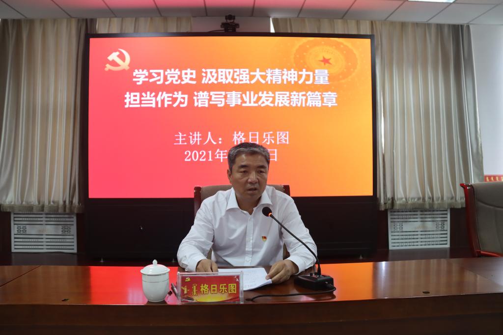 6月29日下午,黨委副書(shū)記、校長(zhǎng)格日樂(lè)圖在綜合樓12樓會(huì)議室講授了題為“學(xué)習(xí)黨史,汲取強(qiáng)大精神力量 擔(dān)當(dāng)作為,譜寫(xiě)事業(yè)發(fā)展新篇章”的黨史學(xué)習(xí)教育專(zhuān)題黨課。校領(lǐng)導(dǎo)、各職能部門(mén)負(fù)責(zé)人,各黨總支書(shū)記、各二級(jí)學(xué)院院長(zhǎng),支部書(shū)記代表,聯(lián)系二級(jí)學(xué)院全體黨員,學(xué)校黨史學(xué)習(xí)教育領(lǐng)導(dǎo)小組辦公室、督導(dǎo)組全體成員,共計(jì)110余人聆聽(tīng)了黨課。黨委委員、紀(jì)委書(shū)記、監(jiān)察專(zhuān)員王冬梅主持黨課。