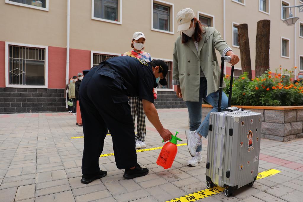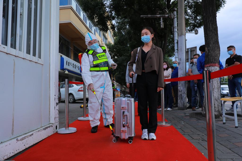 學生間隔一米,經行李消殺、足底消殺、手部消殺、登記及測量體溫合格后,方可進入宿舍。