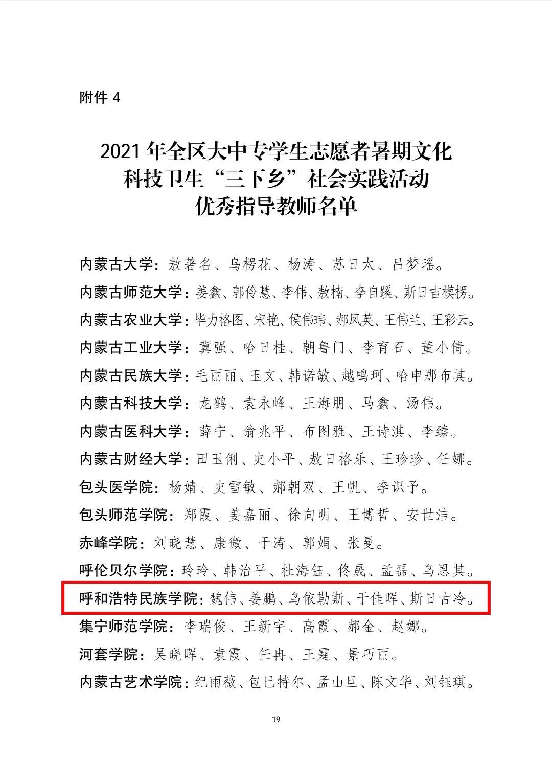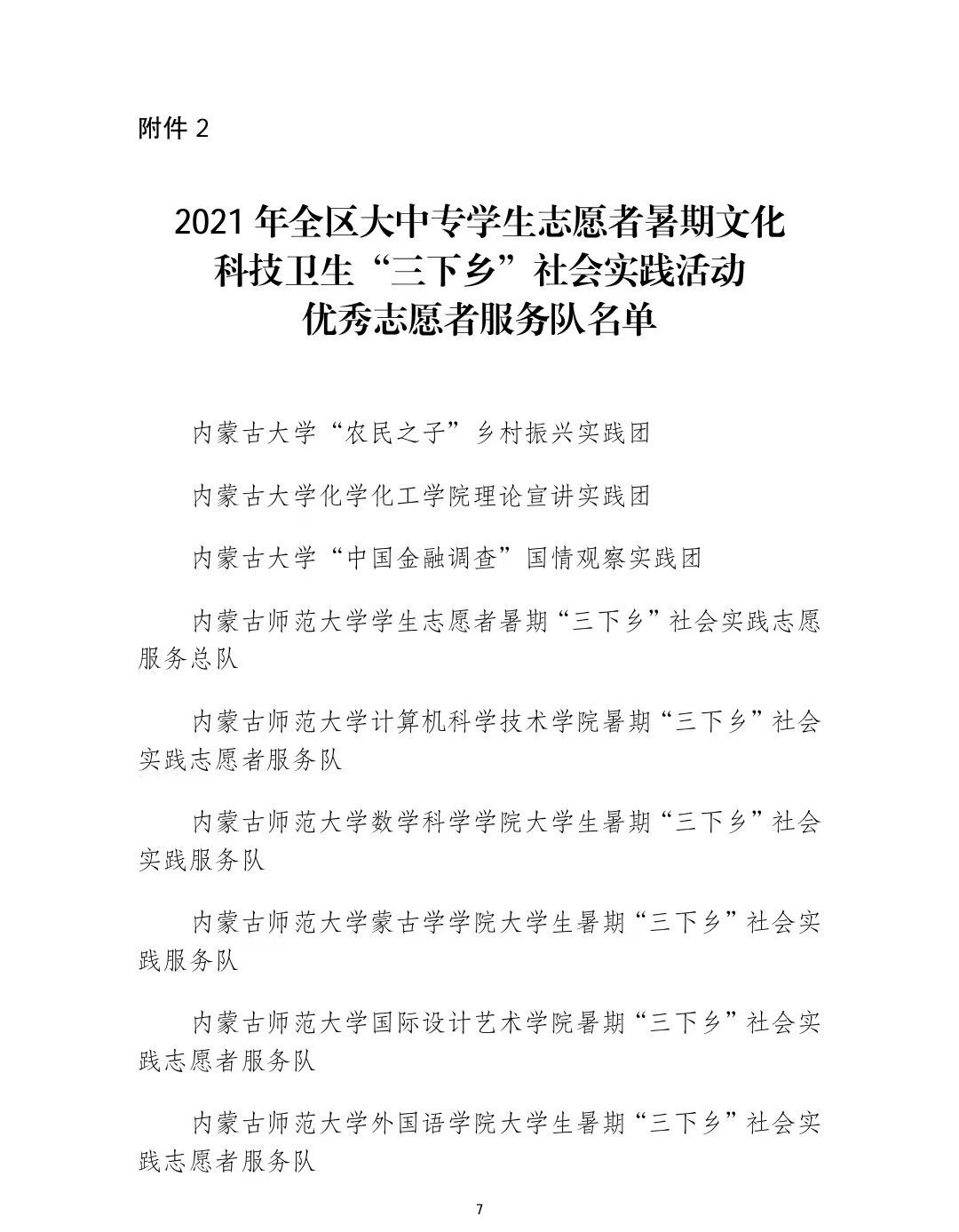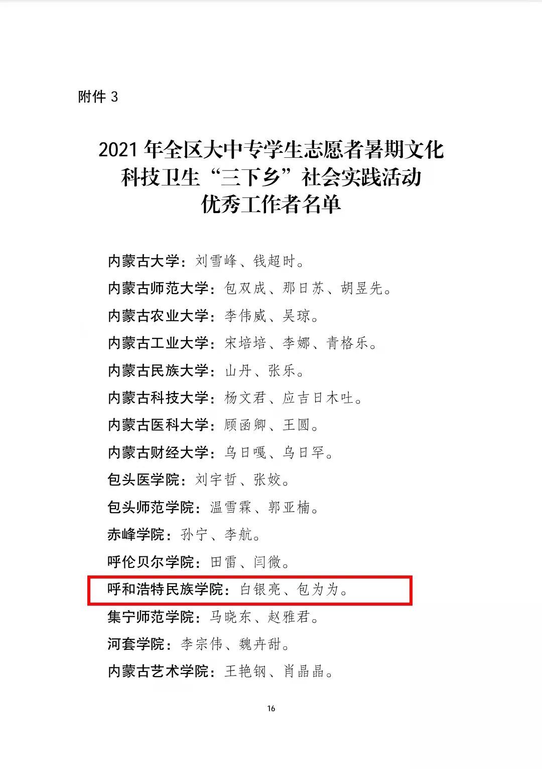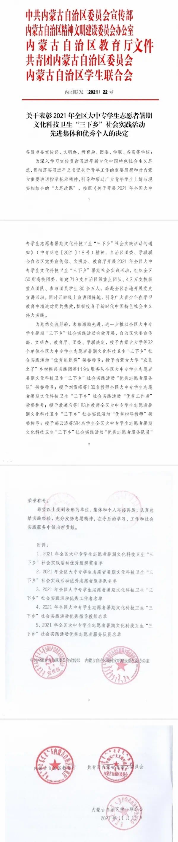在本次表彰中:我校音樂學院黨史學習教育實踐團、數學與大數據學院鄉村振興實踐團、美術學院鄉村振興實踐團榮獲2021年全區大中專學生志愿者暑期“三下鄉”社會實踐活動優秀志愿者服務隊稱號;白銀亮、包為為2名教師榮獲2021年全區大中專學生志愿者暑期“三下鄉”社會實踐活動優秀工作者稱號;魏偉、姜鵬、烏依勒斯、于佳暉、斯日古冷等5名教師榮獲2021年全區大中專學生志愿者暑期“三下鄉”社會實踐活動優秀指導教師榮譽稱號;孫明達、于佳晶、楊泰嘉等16名同學榮獲2021年全區大中專學生志愿者暑期“三下鄉”社會實踐活動優秀志愿者服務隊員稱號。