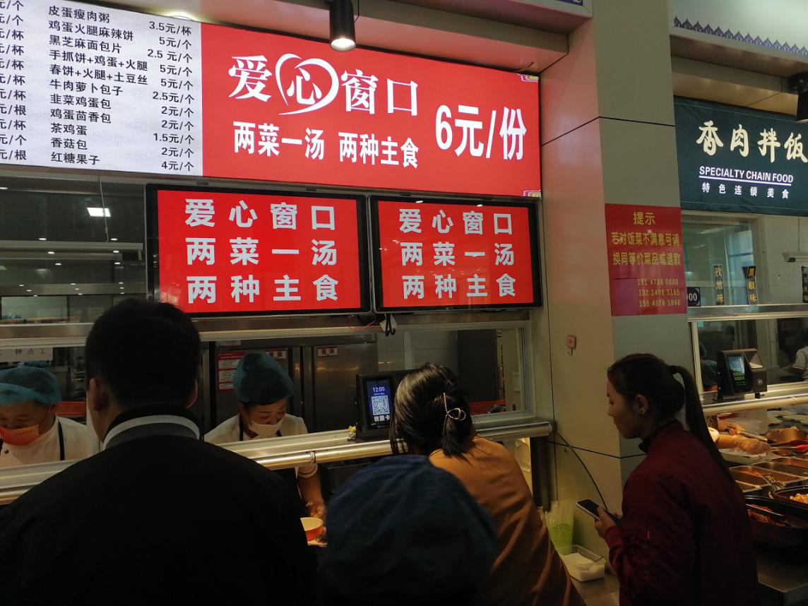 學(xué)校提供政策支持幫扶,后勤管理處黨支部在南、北食堂開設(shè)每份6元的“愛心窗口”。每個愛心窗口每餐安排5道熱菜、2種主食、1種湯,每天不重樣,中午與晚上皆開放,學(xué)生可自選2菜1主食1湯。每天平均賣出1000余份愛心餐。愛心窗口的開設(shè)深受學(xué)生們的喜愛,獲得一致好評。同學(xué)們紛紛表示,“愛心餐物美價廉,緩解了同學(xué)們的經(jīng)濟(jì)壓力,吃著愛心菜,心里感覺很溫暖”。