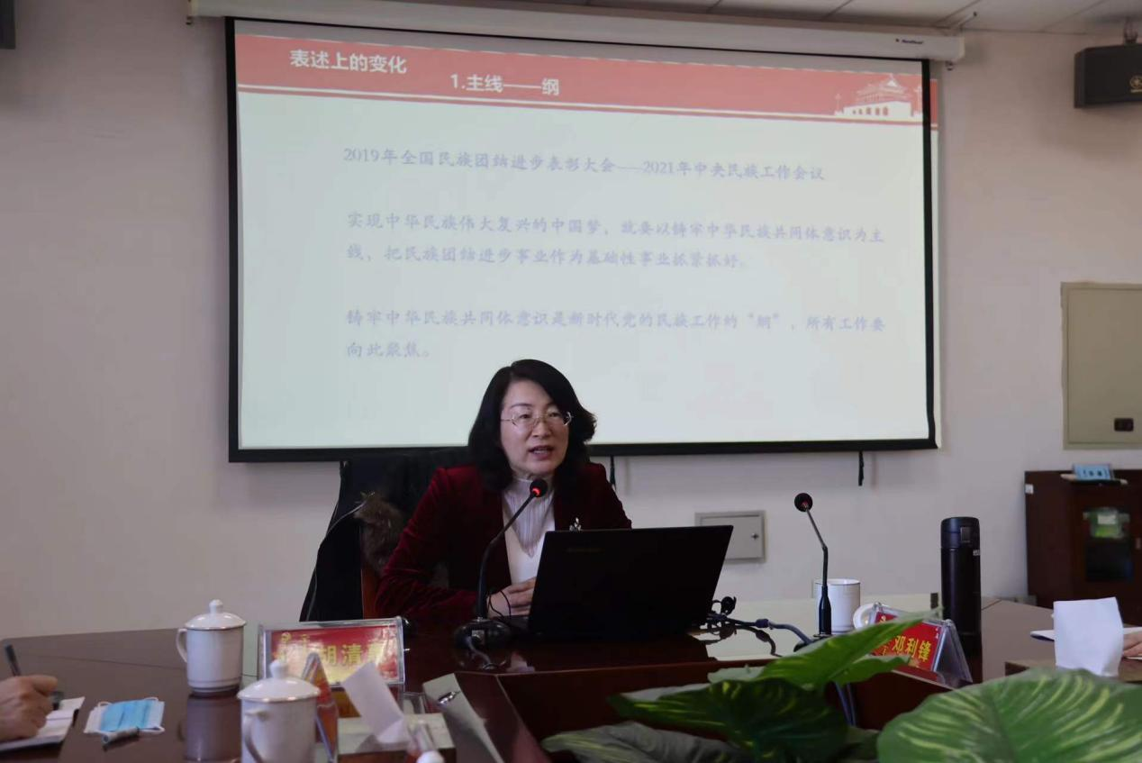 胡清惠教授以“關于中央民族工作會議精神的幾點思考”為題,圍繞中央民族工作有關新思想、新論斷、新提法,我們黨關于加強和改進民族工作的重要思想體系的內在邏輯,深刻理解和把握鑄牢中華民族共同體意識的重大意義,立足基本國情民族工作創新發展要正確把握“四對關系”,鑄牢中華民族共同體意識為主線推動新時代民族工作高質量發展等五個方面展開了深入系統的講解。