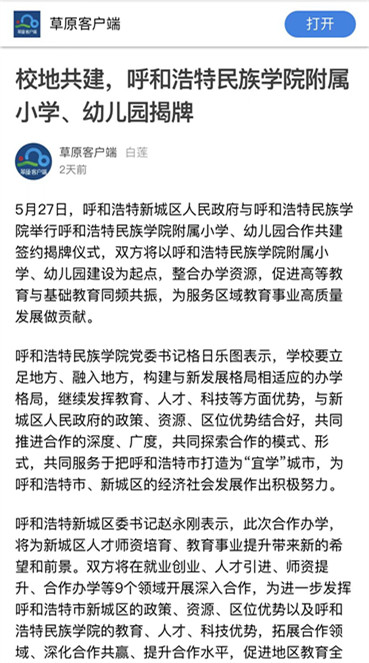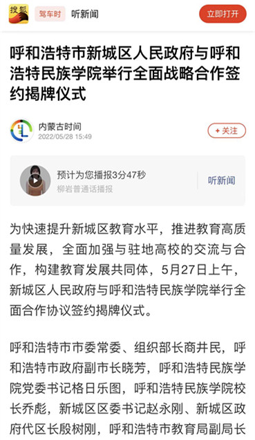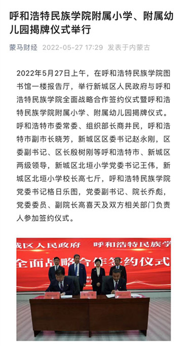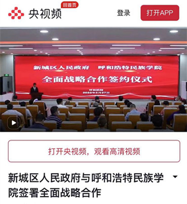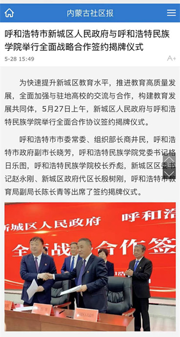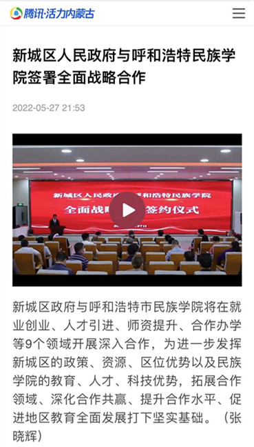 5月27日上午,新城區(qū)人民政府與我校簽署全面戰(zhàn)略合作框架協(xié)議。人民網(wǎng)、新華網(wǎng)、草原客戶端、內(nèi)蒙古新聞網(wǎng)、呼和浩特日?qǐng)?bào)等主流媒體進(jìn)行了跟蹤報(bào)道。新浪新聞、騰訊新聞、搜狐新聞等多家媒體進(jìn)行了轉(zhuǎn)載報(bào)道。媒體的廣泛關(guān)注,進(jìn)一步擴(kuò)大了我校的知名度、美譽(yù)度。