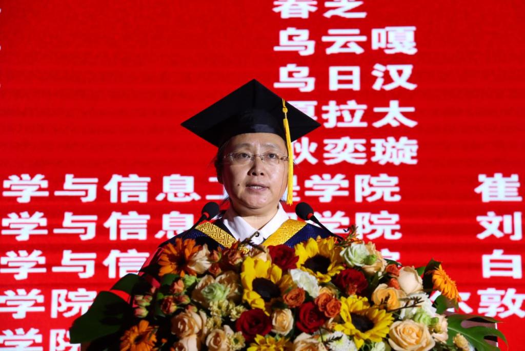 喬彪校長(zhǎng)以《激揚(yáng)青春不散場(chǎng) 踔厲奮發(fā)再遠(yuǎn)航》為題,向全體畢業(yè)生送上臨別寄語(yǔ)和真摯祝福。在講話中,喬彪校長(zhǎng)向現(xiàn)場(chǎng)和直播屏幕前的同學(xué)們致以最熱烈的祝賀,向?yàn)橥瑢W(xué)們的成長(zhǎng)、成才付出心血和辛勤勞動(dòng)的師長(zhǎng)以及親友們,致以衷心的感謝和崇高的敬意。喬彪校長(zhǎng)指出,2022屆畢業(yè)生與黨同心,與祖國(guó)同向同行,和學(xué)校一起見(jiàn)證了黨和國(guó)家的一個(gè)個(gè)歷史性時(shí)刻,你們一路與民院同呼吸、共奮進(jìn),是學(xué)校建設(shè)發(fā)展的親歷者、見(jiàn)證者、參與者。民院也一路與你們心連心、情系情,見(jiàn)證了你們的成長(zhǎng)與進(jìn)步,分享了你們的成功和喜悅。在離別之際,喬彪校長(zhǎng)向畢業(yè)生提出四點(diǎn)希望:一是希望你們厚植家國(guó)情懷,做新時(shí)代矢志不渝的愛(ài)國(guó)者。要把“愛(ài)國(guó)”兩字烙印在心間,把個(gè)人前途與國(guó)家命運(yùn)緊密相連,將小我融入大我,把忠誠(chéng)書(shū)寫(xiě)在黨和人民事業(yè)中,把青春播撒在民族復(fù)興的征程上,以實(shí)際行動(dòng)踐行“請(qǐng)黨放心、強(qiáng)國(guó)有我”的青春誓言。二是希望你們堅(jiān)持終身學(xué)習(xí),做新時(shí)代奮力奔跑的追夢(mèng)人。要把學(xué)習(xí)當(dāng)作一種生活習(xí)慣、一種人生境界,不斷提升自我、完善自我、更新自我,增強(qiáng)本領(lǐng),增長(zhǎng)本事,將個(gè)人夢(mèng)與中國(guó)夢(mèng)有機(jī)融合,以追夢(mèng)人和生力軍的姿態(tài),努力成就敢于有夢(mèng)、勇于追夢(mèng)、勤于圓夢(mèng)的人生。三是希望你們永遠(yuǎn)腳踏實(shí)地,做新時(shí)代勇毅篤行的實(shí)干家。要有“心懷不懼,方能翱翔于天際”的王者氣魄,以“長(zhǎng)風(fēng)破浪會(huì)有時(shí),直掛云帆濟(jì)滄海”的奮斗姿態(tài),磨礪“千磨萬(wàn)擊還堅(jiān)勁,任爾東西南北風(fēng)”的堅(jiān)強(qiáng)意志,把腳踏實(shí)地、鍥而不舍的堅(jiān)強(qiáng)毅力和埋頭苦干、久久為功的優(yōu)良品質(zhì),作為人生航船上的壓艙石,不馳于空想,不騖于虛聲,勇做只爭(zhēng)朝夕的行動(dòng)者、腳踏實(shí)地的實(shí)干家。四是希望你們賡續(xù)紅色血脈,做新時(shí)代團(tuán)結(jié)奮進(jìn)的石榴籽。要一如既往傳承民族團(tuán)結(jié)基因,主動(dòng)肩負(fù)起維護(hù)祖國(guó)統(tǒng)一和民族團(tuán)結(jié)的使命和擔(dān)當(dāng),自覺(jué)做鑄牢中華民族共同體意識(shí)的實(shí)踐者、傳播者、守護(hù)者,讓民族團(tuán)結(jié)之花盛開(kāi)在你們?yōu)閴?mèng)想而奮斗的道路上。