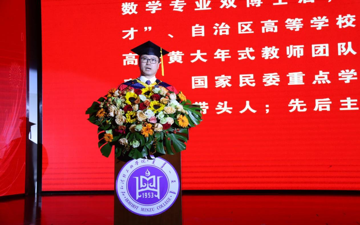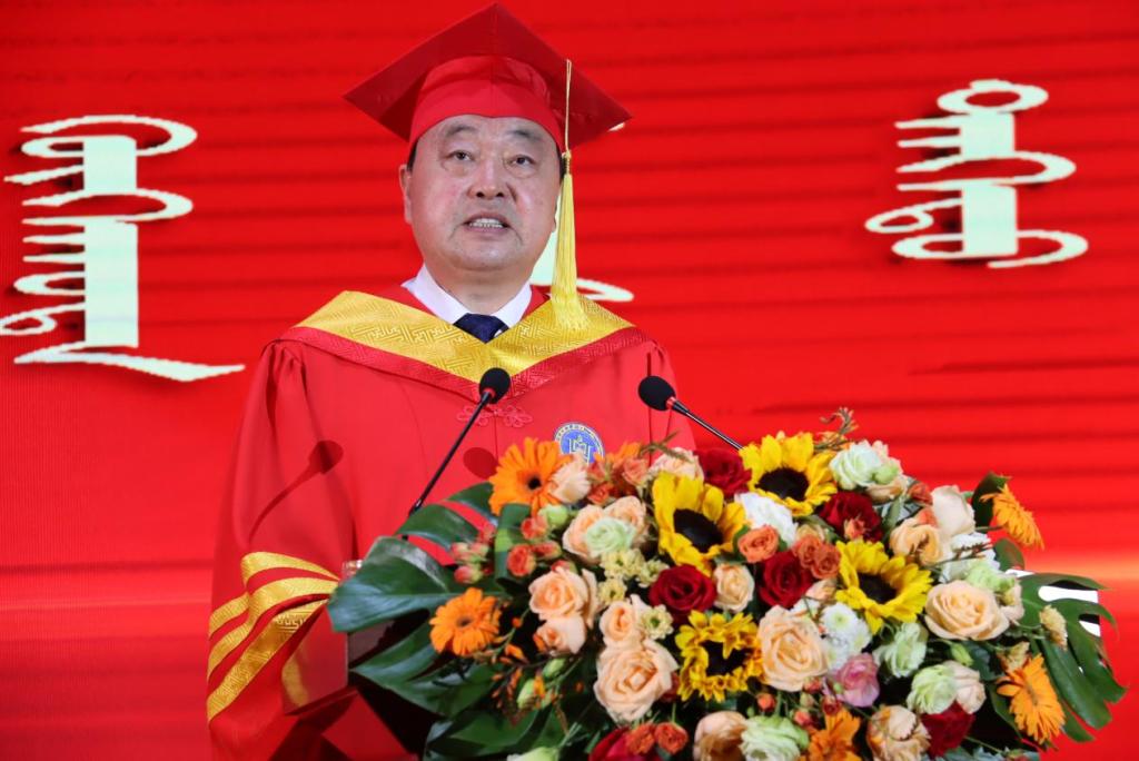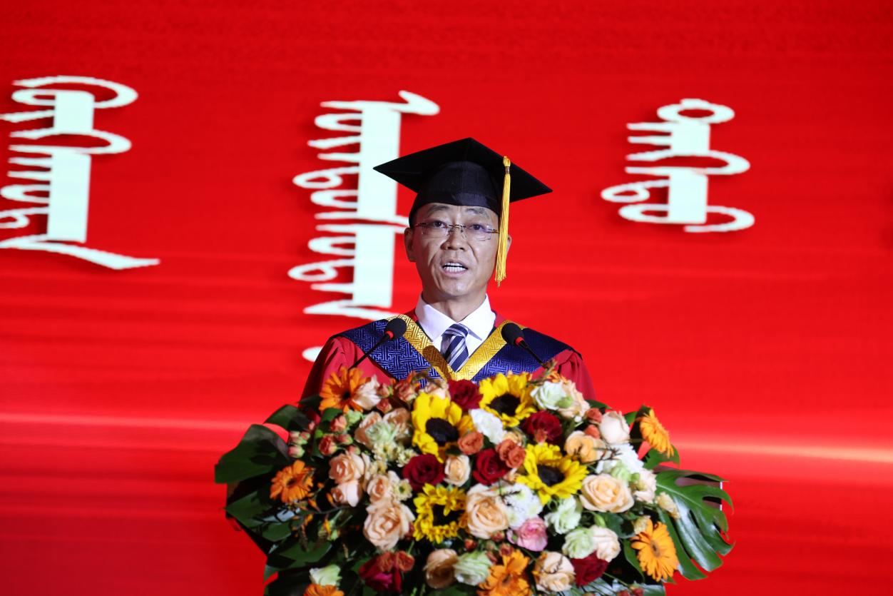 學(xué)位委員會(huì)副主任、黨委委員、教務(wù)處處長(zhǎng)額爾敦布和教授作為教師代表發(fā)言,他真誠(chéng)祝賀同學(xué)們順利完成學(xué)業(yè),希望同學(xué)們爭(zhēng)做有正氣、有責(zé)任、有原則、有志向的青年一代。