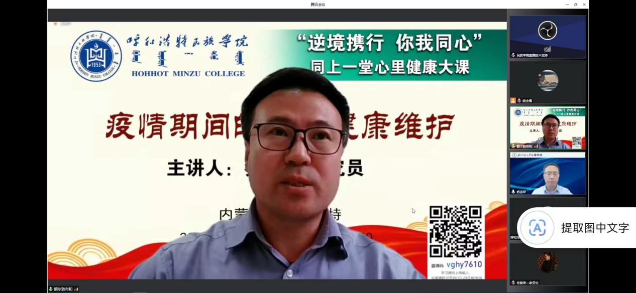 在喜迎黨的二十大勝利召開之際,為筑牢 “疫情”防線,守衛校園平安,引導全校師生時刻保持積極樂觀的健康心態,10月15日下午,學校以直播形式“云端”組織開展了“萬名師生同上一堂心理健康大課”活動。活動由學校黨委委員、教務處處長額爾敦布和主持。