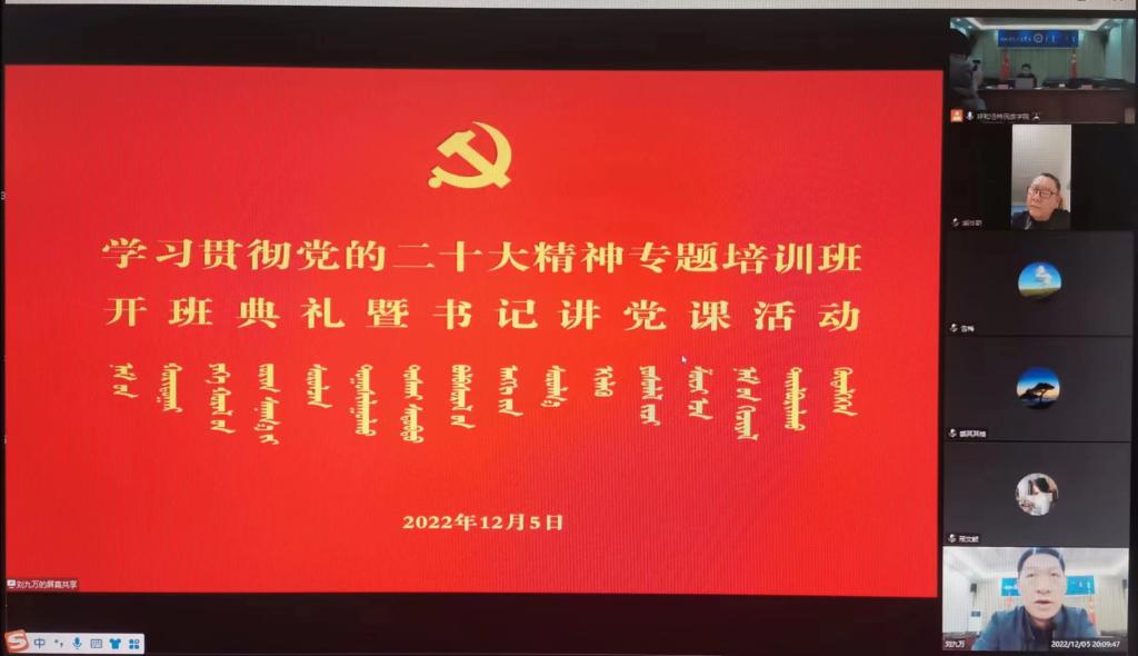 12月5日,學校舉辦學習貫徹黨的二十大精神專題培訓班開班儀式暨黨委書記講黨課活動。劉九萬以《在中國式現代化的新征程上奮勇前進》為題,為二十大精神專題培訓班全體學員講授開班第一課。全校副處級以上領導干部、思政課教師和宣講團成員參加培訓。黨課采取線上線下相結合的方式,主會場設在辦公樓4樓會議室,分會場設在騰訊會議室。專題培訓班開班儀式暨黨課由韓偉新主持。
