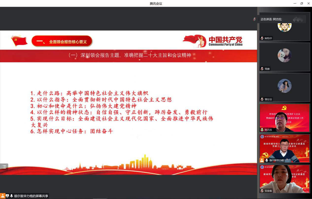 1月9日,新聞傳媒學(xué)院召開黨員大會(huì),校黨委委員、組織部部長吳阿古拉以《學(xué)習(xí)黨的二十大精神 強(qiáng)化黨員使命擔(dān)當(dāng)》為題講黨課,宣講黨的二十大精神。新聞傳媒學(xué)院黨總支書記額爾敦畢力格主持會(huì)議。
