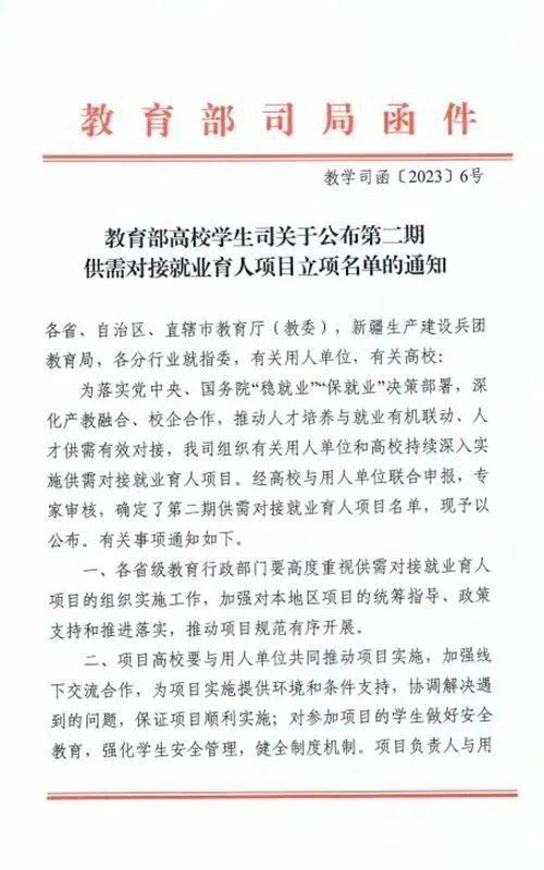 教育部供需對接就業育人項目旨在落實黨中央、國務院“穩就業”“保就業”決策部署,深化產教融合、校企合作,推動人才培養與就業有機聯動、人才供需有效對接。2022年10月,教育部發布申報指南,我校積極規劃,主動與用人單位接洽,3個項目經學校與用人單位聯合申報、專家審核、立項單位信息核查等流程,最終獲批立項。