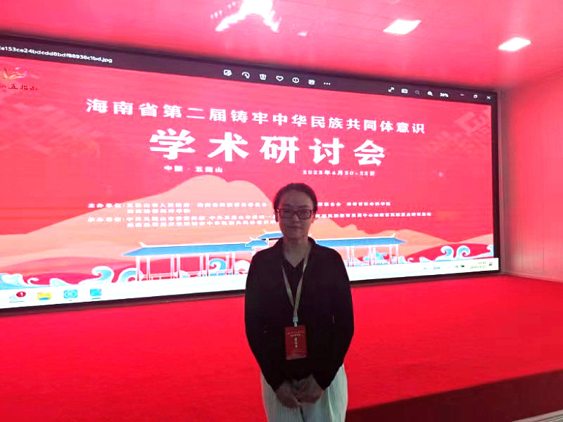 教育部民族教育發展中心海南民族教育重點研究基地、海南熱帶海洋學院鑄牢中華民族共同體意識研究中心等承辦的海南省第二屆鑄牢中華民族共同體意識學術研討會于4月20日至22日在五指山市召開,來自中國人民大學、中央民族大學、復旦大學、西南民族大學、西北民族大學、內蒙古大學、內蒙古農業大學等百余位專家學者匯聚一堂,共同研究探討鑄牢中華民族共同體意識這一時代課題。我校黨委副書記胡春梅教授應邀以文參會,提交《民族地區高校校園文化中鑄牢中華民族共同體意識路徑研究》一文,并在“民族教育與心理”為專題的分會場進行交流發言,得到與會同行的高度認可。