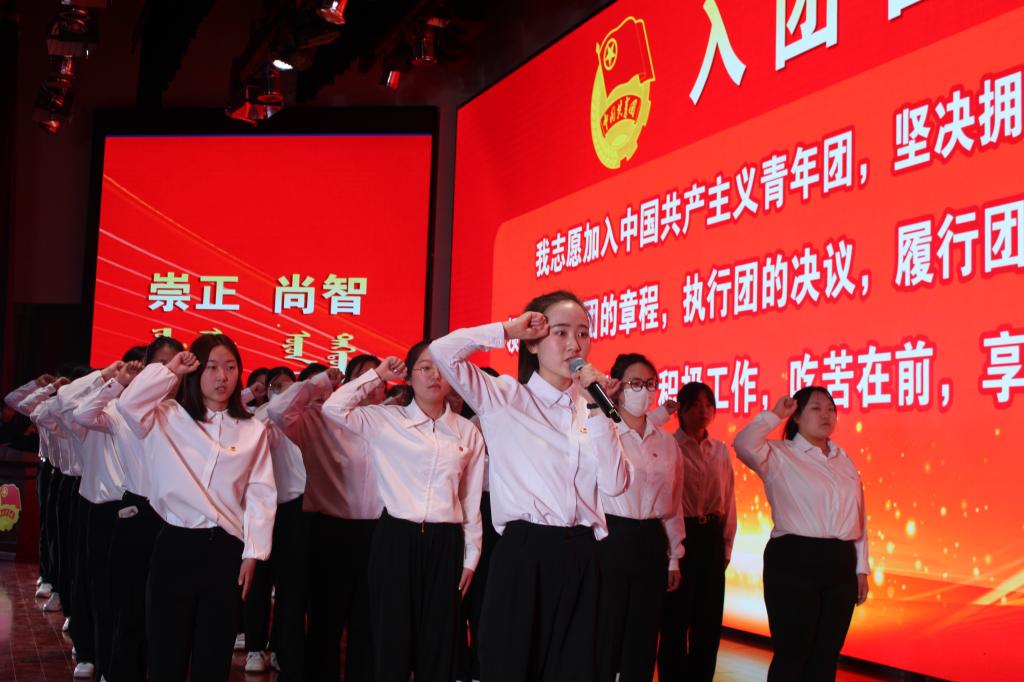 會上,學生工作部部長楊福梅宣讀了表彰決定。先進集體代表教師姜鵬、優秀共青團員代表吳麗麗分別在大會上作了交流發言。結束表彰環節之后,進行了新團員入團儀式暨老團員重溫入團誓詞儀式。入團儀式后,由竇建文、張翎艷等青年學生代表共同朗誦《五四的火炬》,啟發與會青年們不忘初心勇擔當,牢記使命再起航。