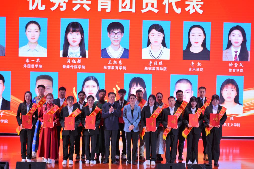大會對我校2022—2023學年以來涌現出的優秀共青團員、優秀共青團干部、五四紅旗團支部、五四紅旗團總支等先進集體和個人進行了表彰,與會全體校領導為獲獎代表頒獎。