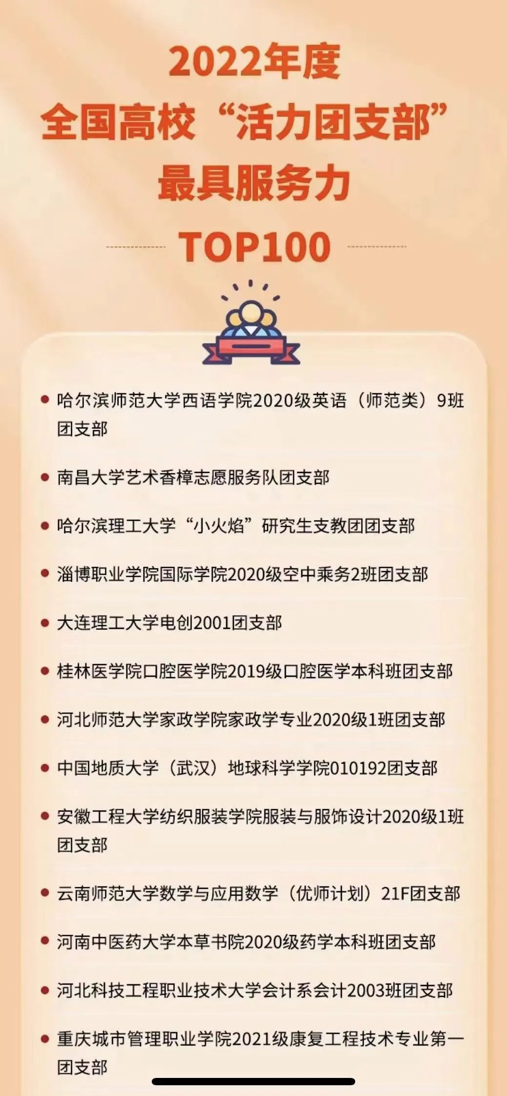 據悉,2022年度全國高校“活力團支部”風采展示活動由團中央基層建設部指導、中國青年報社開展,在引領力、組織力、服務力、貢獻度、改革味、好作風6個方面,通過新媒體方式集中展現高校團支部改革建設成果和典型經驗,深入貫徹“全團抓思想政治引領”“全團大抓基層”“全團抓學校”工作部署,提高高校團支部影響力。經過校內選樹、校級展示、省級展示、全國展示等環節,形成TOP100榜單。