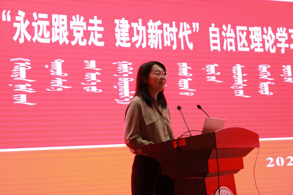 黨的二十大代表、鄂爾多斯市準格爾旗迎澤街道南苑社區黨支部書記、居委會主任鄧郁,巴彥淖爾市烏梁素海海區管理大隊大隊長劉文斌,通遼市委黨校基礎理論與黨史黨建教研室副主任趙淑芳副教授,內蒙古建筑職業技術學院馬克思主義學院教師張靜,內蒙古醫科大學馬克思主義學院副院長王彥副教授,內蒙古農業大學職業技術學院旅游管理系黨總支書記賀斐副教授等六位宣講團成員結合自身學習工作經歷和實踐體會收獲,分別以《扎根基層 向陽而生》《牢記總書記囑托,呵護好烏梁素海這顆“塞外明珠”》《站在草原望北京》《只此青綠:北疆防沙治沙的代代堅守》《以改革創新推進內蒙古現代化建設》《我們仨的大學夢》為題作了精彩宣講。