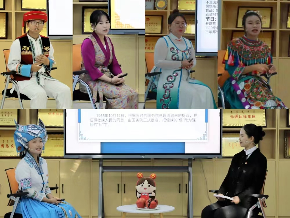 活動中,瑤族、藏族、回族、壯族、侗族五位同學分別介紹了各自民族的風俗習慣、分享了各族人民團結互助的感人故事,并與觀眾進行了互動。