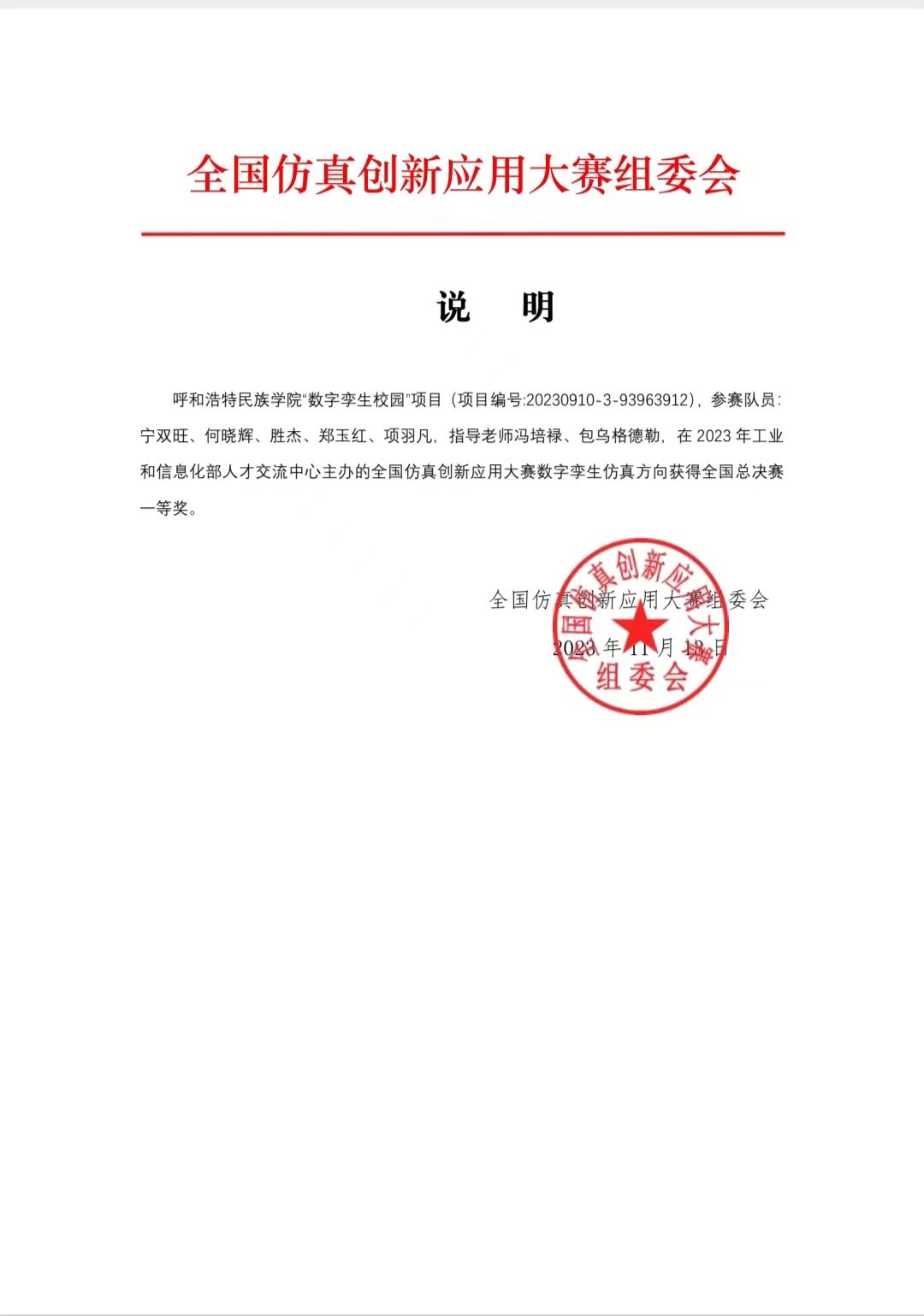 11月13日,由我校計(jì)算機(jī)科學(xué)學(xué)院教師馮培祿、包烏格德勒指導(dǎo),寧雙旺、何曉輝、勝杰、鄭玉紅、項(xiàng)羽凡五位同學(xué)組成參賽隊(duì)的《數(shù)字孿生校園》項(xiàng)目(項(xiàng)目編號(hào):20230910-3-93963912)在2023年工業(yè)和信息化部人才交流中心主辦的全國(guó)仿真創(chuàng)新大賽數(shù)字孿生仿真方向獲得全國(guó)總決賽一等獎(jiǎng)。