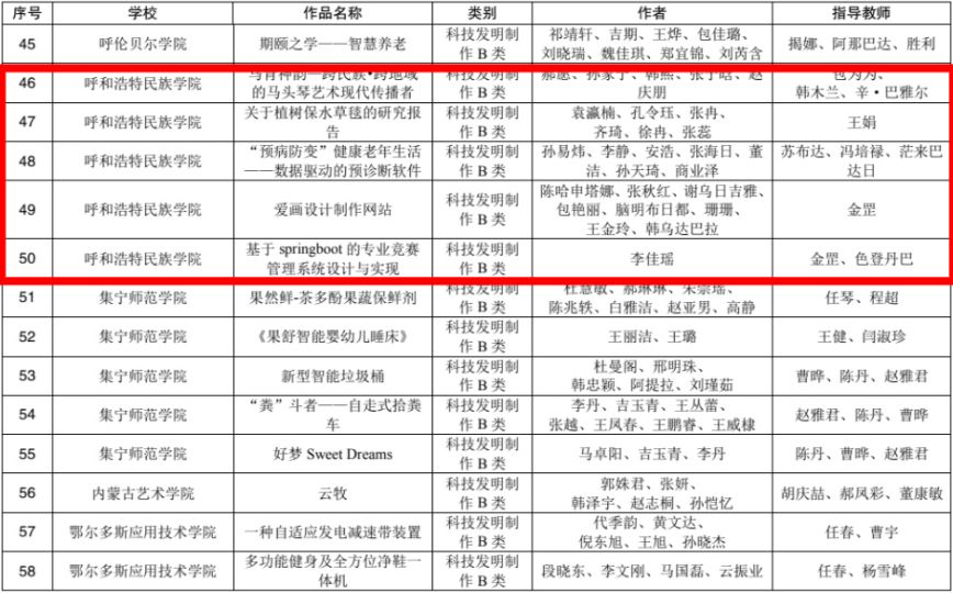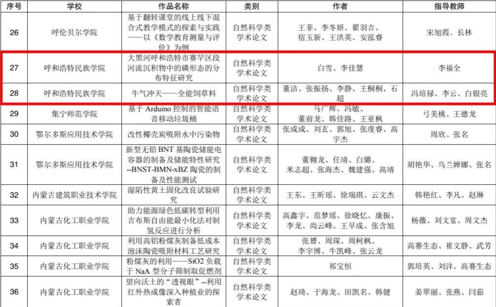 近日,內蒙古自治區第十三屆“挑戰杯”全區大學生課外學術科技作品競賽獲獎名單公布。我校經學院推薦、專家現場評審,最終選送40份作品參加省賽,34份作品獲獎,其中,本科組特等獎2項、一等獎2項、二等獎5項、三等獎25項。學校榮獲“優秀組織獎”,2名老師獲“優秀工作者”榮譽稱號。