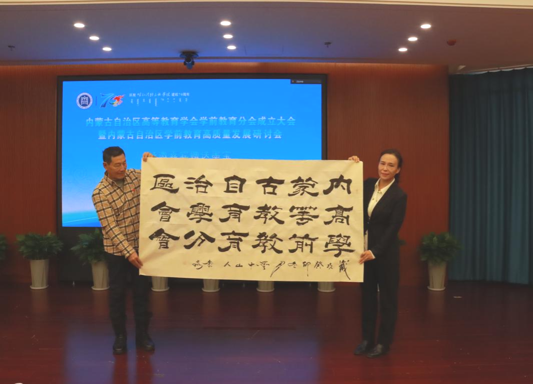 韓偉新和高教學會副秘書長、內蒙古工業大學馬克思主義學院黨委書記王文華共同為學前教育分會揭牌。中國書畫協會副主席彭淼贈送墨寶,學前教育學院黨總支書記娜仁其木格接受饋贈。
