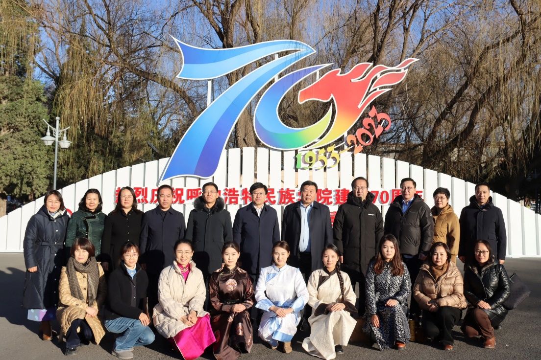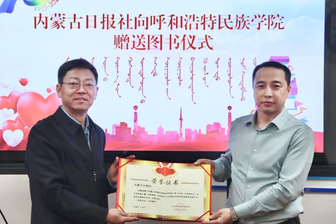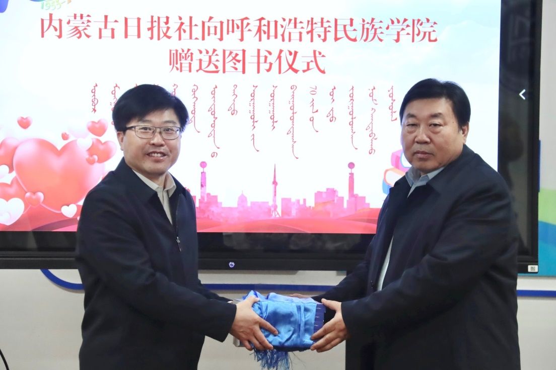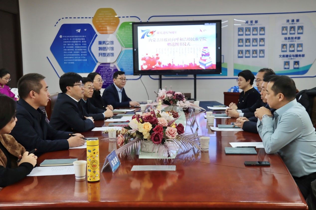 12月1日,適逢呼和浩特民族學院喜迎70周年校慶之際,自治區(qū)人大教科文衛(wèi)委員會副主任委員吳海龍,內蒙古日報社編委委員、素倫嘎新聞中心主任金山等一行四人蒞臨我校贈送圖書。校黨委副書記、校長韓偉新,校黨委委員、副校長高喜天出席贈書儀式。圖書館負責人、新聞傳媒學院領導班子及師生代表參加了贈書儀式。
