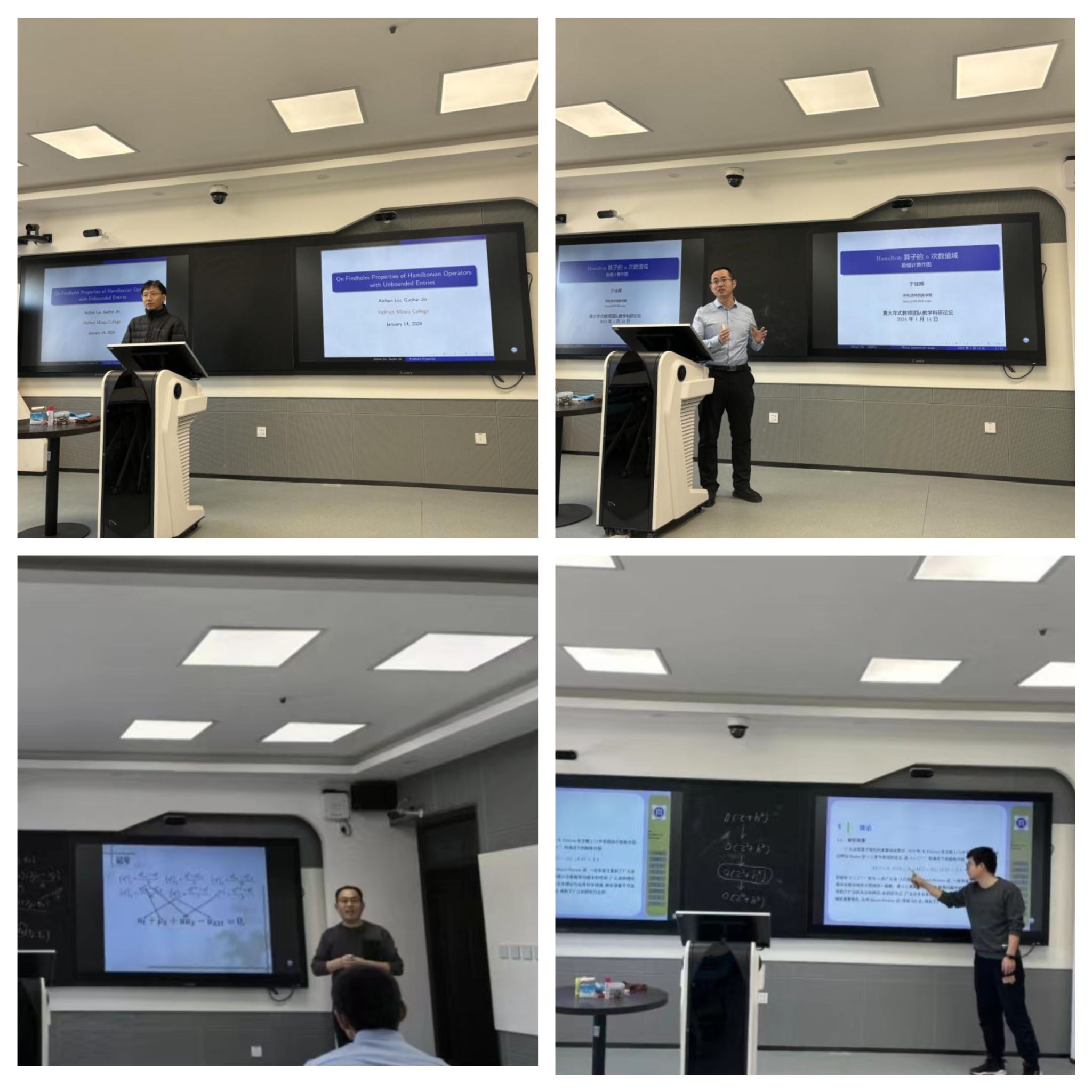 會上,黃大年式教師團隊金國海、于佳暉、高晶英、李小鵬四位教師依次分別作了題為“On Fredholm Properties of Hamiltonian Operators with Unbounded Entries” “Hamilton算子的n次數值域”“對稱正則長波方程的時間兩層差分格式”“Hilbert C*-模上算子矩陣的EP和hypo-EP性”等四場學術報告。